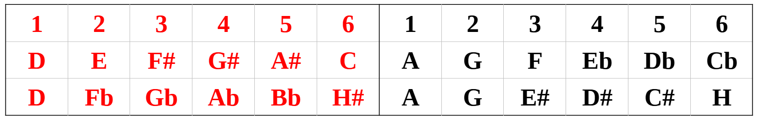 A piros a mi Téridőnk, a fekete az Anti-Téridő. Mindkettőnél 6 Forrásszámot találunk. Az egymás alatt levő Hangok enharmónikus hangzásban vannak egymással, de mint látjuk elnevezésük teljesen eltérő egymástól. Ezek azok a Helyek, ahol új Forrás, új fraktálelágazódás keletkezik, ahol az élet új és újabb létezési formát hoz világra.