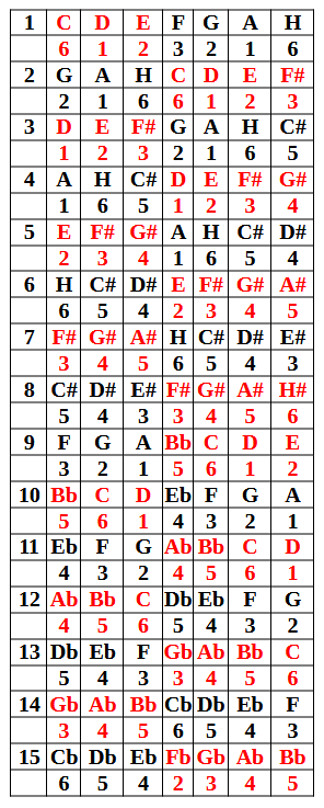 Ebben a rendszerben 15 dúr hangnemet találunk, és minden Hang alatt megtalálható a mi Téridőnk és az Anti-Téridő forrásszámai. Ami rögtön feltűnik, hogy egy kiegyensúlyozott létezési formát adnak ki a forrásszámok.