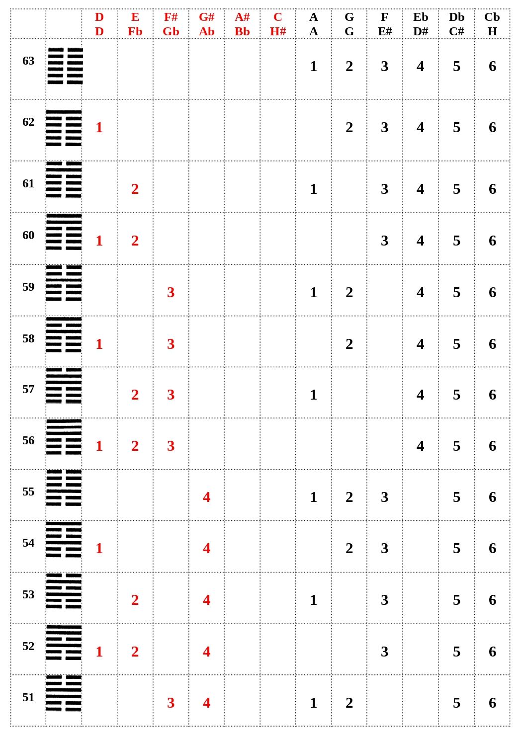 A táblázatban minden egymás mellett elhelyezkedő Hang között egy kvinttávolság van. Tehát kettő Hanggal odébb kettő kvinttávolság van, majd így növekszik a kvinttávolságok száma. Kettő színt választottam, a pirosat és a feketét. A piros a Jézusi Téridő Hangjait jelöli, a fekete pedig a Luciferi, az Anti-Téridő Hangjait mutatja. A számok a Téridő Források megjelenési sorrendjét ábrázolják. Az azonos színben levő számok (5-5, 4-4) enharmónikus kapcsolatban vannak egymással. Mintha egy Hang lenne a kettő, megnyilvánulásukban viszont egy „kettős hangzás”, fraktál elágazódás mutatkozik. Igaz, a táblázatban minden azonos számmal megjelölt Hang között 12 kvintugrás van, de egy oktávon belül egy ugyanazon helyre kerülnek.