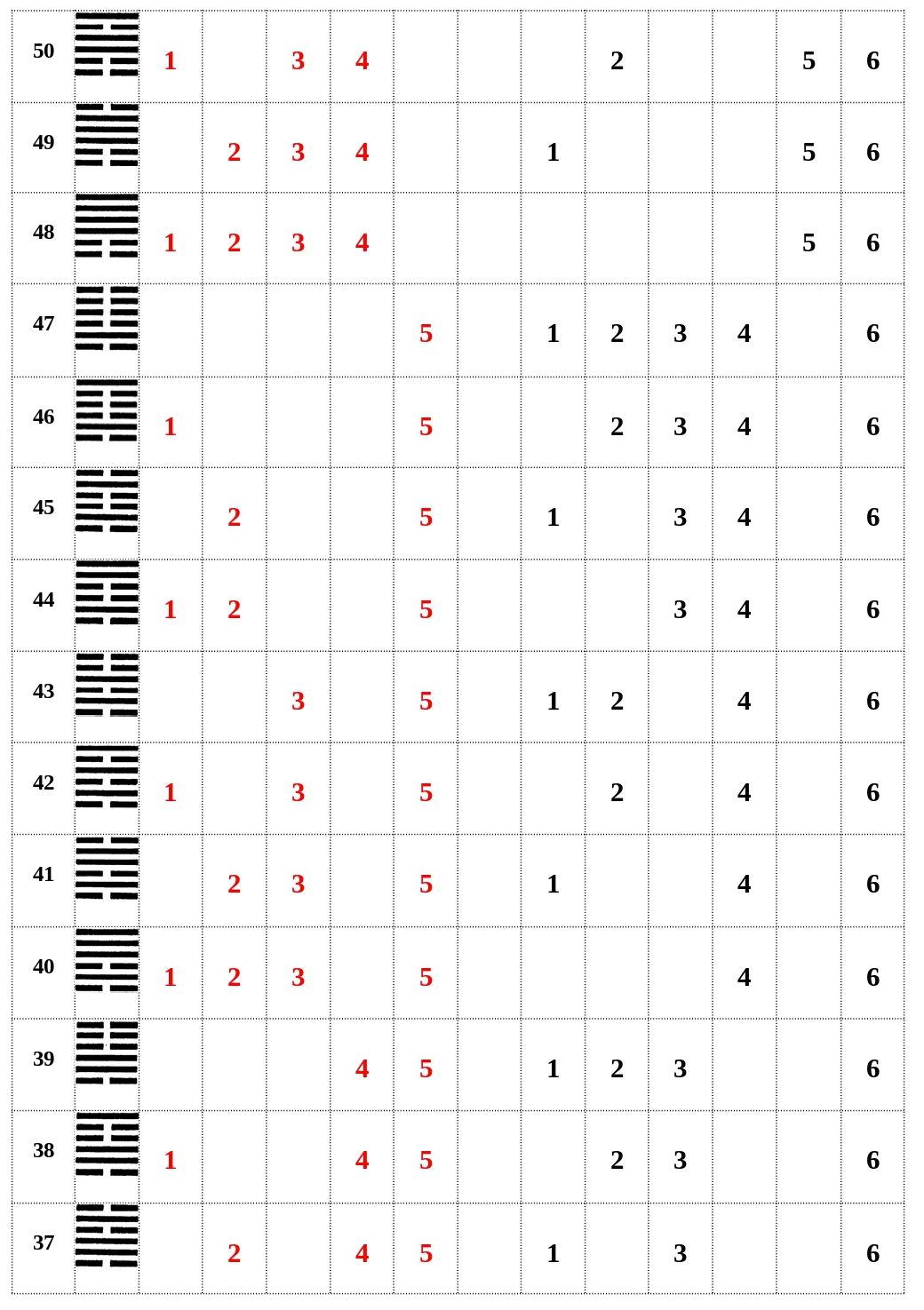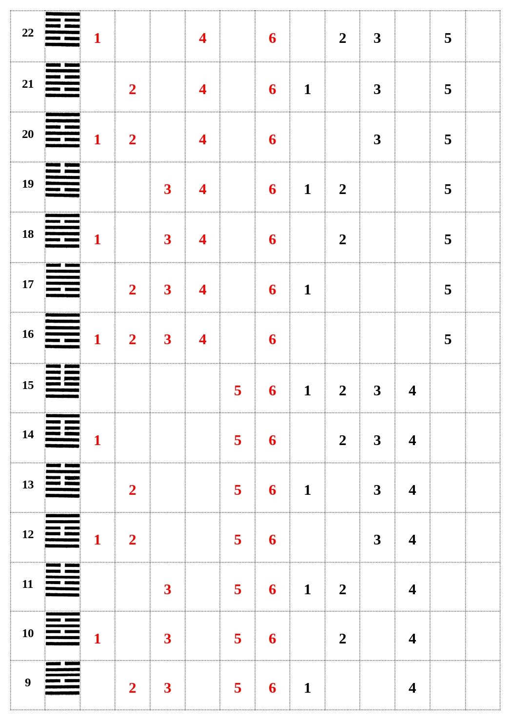 A legfelső, tehát felülről az első sorok váltakozási sorrendje: 1 hosszú, 1 rövid (ez a két rövid), 1 hosszú, 1 rövid, ez ismétlődik 32 alkalommal.