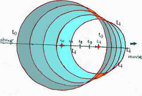 A kiáradás a t0 tengelyponton indult, és a t4 pontban ért véget. Itt valójában analóg az idő. A forrás valahol abban a pontban gondolható el, ahol a kúp csúcsa lenne, de ez a pont már nem esik a képre. Itt most egy régebbi kiáradását analizáljuk. Legelöl a legfiatalabb, legkésőbb kiáradt időesszencia halad, és ezt a rendszer belsejében is megtaláljuk, éppen a t1-es valamikori kiáradási pontot metszi a mozgástengelyen. Erre a tengelyre írtam azt, hogy string. Figyeljük meg, hogy a rendszerbe jobbról-balra a tengelyen behaladva először a t4, majd a t3, t2, t1, t0 tengelypillanatot látjuk meg, majd (ahol a fehér zónába érünk) eltűnik a forrás a szemünk elől, majd a dolog egészen pontosan megismétlődik t4, t3, t2, t1, t0. |
