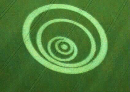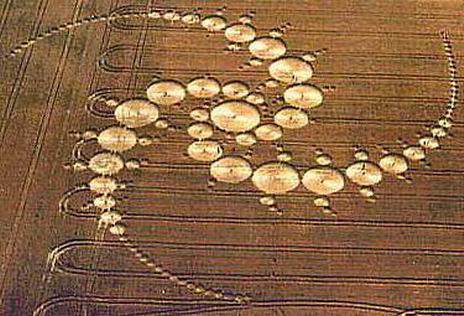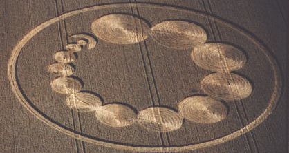 A teremtés következő fázisai is korrektül megvannak az "életbe", a gabonába rajzolt ábrák között. Ez az ábra a Kaosz gerjedési szabályát mutatta, amikor a Víz a Tüzet, a fénysebesség feletti sebességgel mozgó forrást keletkezteti. A lenti képen már az univerzum fennmaradásának alapelve látható. Így keletkezik és működik egy fénykvantum. A körök átmérőjének a csökkenése az emanáció inverze, magyarul a fénysebesség többszörösével haladó kiáradó forrás ilyen eseményhorizontot kiárasztó tartamrendszert hagy hátra. Itt az egyre kisebb körök ezt világosan mutatják. No de, mit akar tanítani az a kis holdacska a legkisebb kör előtt? |