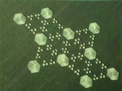 Kiterített oktaéder és a hangsúlyozott hatos szimmetria. A nagy hatszögek közötti kis hatszögek mindig az alakzat belseje felé mutató háromszögeket képez. 10 nagy és 116 kis hatszög. A légifelvételen látszik feltűnő pontossága is. |