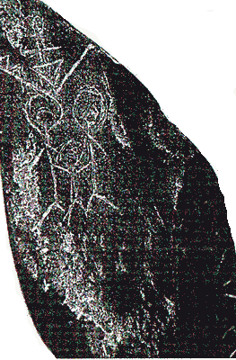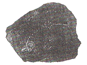 További palakő relikviák, amelyek ugyanannak a hősies expedíciónak az emlékeiből ránk maradtak. A bal felsőn egyértelmű rovásírásos feliratok vannak, de ezek némi eltérést mutatnak a hun-magyar rovásoktól. A szavak közötti kettőspontok szíriuszi szokás szerint ide oda dőlnek, vagy egyenesen állnak. Ez a szóköz jele, és ezek a mai szíriuszi nép írásában is megfigyelhetők, azt jelzik, hogy ez az írás nagyon-nagyon régi. Sokkal régebbi, mint azok a betűk, amelyekkel ezt a szöveget írom. Legalább 4-5000 évesnek gondolom. Az Üzenet a Sánta Katáról Arvisura sorozatban az ötödik lapon közöltünk jó néhány rovásírás ABC-t és ezek mindenkinek a segítségére lehetnek a titokzatos fekete köveken látható feliratrovások megfejtésénél. Ha valaki úgy érzi, hogy eljutott a helyes megfejtéshez, úgy az írjon nekünk egy e-mailt az eredményéről. babel@post.com . Az alsó kövön is egy utazás története látható, ami egy csillag bolygójához vezet, de itt egy nyolcas szimmetriájú (fényt jelentő) sugaras jelen át. Fent is egy csillagábrázolás van rajta. A csillagok nevei is fel vannak róva a lapra.