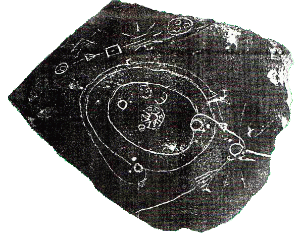 | A lejjebb lévő rajzolaton már egy sokkal hosszabb történet olvasható. Itt egyértelműen érkezésről van szó, mert a rajzon lévő deltaszárnyú űrrepülőgép a kép belseje felé halad. Méghozzá a Jupiter felé. Ennek négy nagyobb holdja ezt világosan jelzi. A beljebb található bolygóknak csak egy vagy két holdja van, így ez leginkább csak a Jupiter lehet. Ennek két holdjára is leszálltak a jövevények, mert a továbbút nem ugyanarról a holdról vezet tovább, mint ahová az alulról érkező hajó útvonala irányul. Két hajónak kellett lennie, (és a palakő nagyobb lehetett) mert a jobb oldalról egy igen erőteljes fehér vonal irányul a Jupiterhold felé. Ez nagy valószínűséggel a legbelső nagy hold az IO lehet, mert a rajzon ez van a legközelebb rajzolva az óriásbolygóhoz. Az először említett legnagyobbra rajzolt hajó az EURÓPÁN szállhatott le, mert ez a második nagy holdja a Jupiternek. A GANIMEDES és A CALLISTO is látszik a rajzon, de ezekhez nem vezet útvonal. A holdak állása egyúttal egy időpontot is jelöl, bár a gyors keringésű holdak miatt ez inkább csak intervallum. DE, mivel a többi, a Jupitertől beljebb lévő másik három bolygó is ábrázolva van, ez pontosabb időpont becslést tesz lehetővé. A két feltételezett űrhajó elméletét az is alátámasztja, hogy a Jupiter és a Mars bolygópálya közötti úton az expedíció a rajz szerint kettévált. Ez a kétfelé indulás valahová a kisbolygók övezetére esett. Lehet, hogy a Phaeton bolygót keresték, de ennek már csak a törmelékét találták. Ez a Nibiru (12.bolygó) Északi szél nevű holdjával való összeütközésben teljesen elpusztult. Ez a bolygó és a Mars is lakott volt, amiről még vannak régi feljegyzései a Földnek, amiben a három bolygó királyairól tesznek említést. Ez egyúttal utalás arra is, hogy ez az esemény nem millió évekkel ezelőtt történt, hanem legfeljebb 5-10000 éve. Ezt támasztja alá az is, hogy a görög mitológiában is említést találunk a Phaeton-ról, aki itt a Napisten, Helios engedetlen fia. Ebben a legendában földi tűzözönről is szó esik. Ezután a képen az expedíció két irányba indult el. |