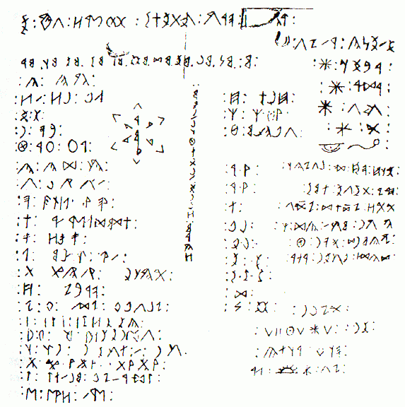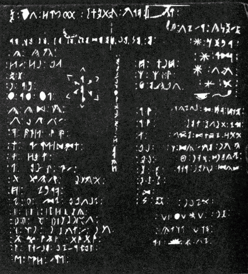 A könnyebbség kedvéért negatív képen is No és ez alatt egy igazi tudományos szenzáció lapul, mert az ezer éves táblán a lélekmadár neve alatt egy petesejt és egy spermium félremagyarázhatatlan képe van. A spermium ilyen pontos ábrázolása napjainkban természetes, de mikroszkóp nélkül erről fogalmunk se lenne. Azt pedig még csak sok-sok évszázaddal később fedeztük fel. A jobb alsó sarokban: BAKON, EN 557, PaTaK ATILa, KeS 100 nap RA. Vagyis ez a palára rótt ősirat nagyon régi, különösen akkor ha a régi időszámításunk évszámai szerint rótták. Ma (2003 március 21-től, a tavaszi napfordulótól számított ősi időszámításunkban) 6044-et írunk. Az asztrológia is ezzel az időponttal kezdi az évet. |