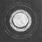 Az ionmikroszkópos képen megfigyelhető végtelenbe tartó, gömbszerűen szétáradó hullámtér okozza a "kohéziós erőt, ez tartja együtt a kristály atomjait, de ez az atomok által keltett görbült tét okozza a gravitációt is. Nem elgörbül, hanem így árad ki az atomokból. Görbén. Mert ez a létezés tartozéka. Az is megfigyelhető, hogy az atom közelében még markáns vonalak a távolsággal egyre vékonyodnak. Ez nagyon hasonlít a fény diffrakciójánál is megfigyelhető jelenséghez. |