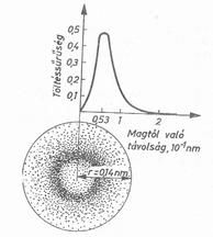 Egy vékony aranyfólián így szóródnak az elektronok. Ez bizony nagyon hasonlít a kis lyukon áthaladó fénykvantumok által keltett diffrakciós képhez. Ennek oka ugyanaz, mint a fényelhajlásé, mivel az elektronokat ugyanúgy eltérítik az aranyatomok nagy nukleonszámú görbült terei, mint a fénykvantumokat is. Itt is atomi terekben haladnak át az elektronok, majdnem ugyanúgy, mint a fényelhajlásnál a fénykvantumok. Ha megnézzük a valószínűségét egy hidrogénatom elektronjának, akkor annak ilyen a valószínűségi szórásképe. Lényegében itt végtelen számú pontot kellett volna az ábrára rajzolni, hiszen ez a valószínűségi ábra csak azt mutatja, hogy hol található leginkább az ominózus elektron. A sűrűbben pontozott térrészben van a leginkább. Az is látszik, hogy ez 0,53 nanométerre van az atom centrumától. Egy nagyon érdekes és nagyon szemléletes ábra, amivel némileg ellentmondani látszik az az ábra, amiben a hidrogénatom elektronkonfigurációit vehetjük szemügyre, ahol bizony igen nagy eltérés látható a hidrogén különböző gerjesztettségi állapotainál. Ez is hidrogénatom és ez is valószínűségi ábrázolás. |