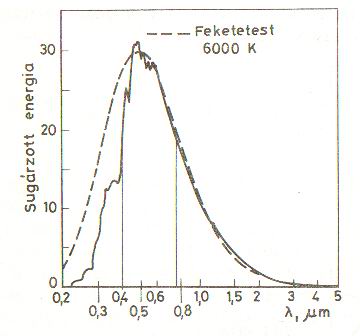 A képen a Nap spektrális sugárzási eloszlása látható. A szaggatott vonal a feketetest sugárzási görbéje van, az, ami az ideális eloszlás lenne. Ez a görbe extraterresztrikus, vagyis a világűrben lett mérve. A két párhuzamos függőleges vonal a látható sáv. Ez a sok évtizedes mérés azért még sok mindent figyelmen kívül hagy. De azt megfigyelhetjük rajta, hogy a 3 mikrométer hullámhossznál már szinte alig van sugárzás, és 5-nél gyakorlatilag meg is szűnik. Ugyanígy elenyészik a baloldalon is kb. 0,22 mikrométernél. Ez már ultraviola. Ez a dolog jó a Föld lakóinak, mert így a káros sugárzások ennek a jótékony színszűrésnek a következtében nem éri el a Földet. Ennek a napszél, a Nap korpuszkuláris sugárzása a főoka. A Nap és a Föld között a Föld felé száguldó atomok vannak. 150 millió kilométeren át. További védelmet ad a Van-Allen övezet, amit a Föld mágneses tere tart életben. Ez, mint egy párna öleli körül a bolygónkat. Érdekes, hogy ez sok nitrogént hordoz. |