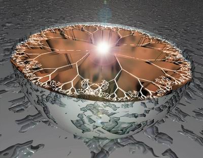 Egy nyugalomban lévő neutron körülbelül így néz ki belülről. Csak minden állandóan mozgásban van benne. Ebből most hiányzik a fény, mert akkor egy nagy kékesfehér ragyogás lenne az egésznek a belsejében. Hogy honnan tudom? Megnéztem. Elegendő egy atomot megsemmisíteni, és máris látjuk azt, hogy milyen színű fénnyel is van tele. Amikor elpukkad, az fog előtörni belőle. Erre nagyon jó kísérleti alkalmat nyújt a kavitációs buborékok megfigyelése. Itt sem elektromos ív, sem kívülről érkező fény, sem ugyaninnen rákényszerített magas hőmérséklet nincsen, és a kavitációs buborékok mégis kékesfehér fénnyel tündökölnek agóniájuk során. Egy gombostűfejnyi gömb mentén minden létezhető anyag eltűnik, és a bennük lévő összes fénykvantum kiárad a környezetbe. Ez szerencsére nem okoz láncreakciót. |
