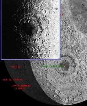 Afrikától keletre körülbelül a Zöld-foki szigetek térségében látszik az leszóródás centruma, itt és az Azori szigeteknél bizonyára könnyű holdkőzethez jutni. A kéreg a sötétre satírozott részeknél szakadt be, és itt hatalmas, hat kilométer mély gödrök vannak az óceán fenekén. A szélességi háló itt kb. 1111 km-es, és ez alátámasztja az elméletemet. Az Azori szigetek Portugáliához tartoztak, és akkor ma az Európai Unióhoz. Akkor van nekünk elegendő holdkőzetünk, még űrhajó sem kell hozzá. A Holdnak a titokzatos túloldalán van az ütközés nyoma? Ilyen koncentrikus kráter nem egykönnyen keletkezik meteor becsapódástól. Ennek komoly esélye nincsen. |
