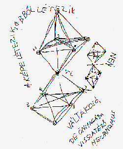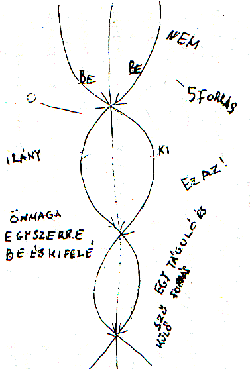 + A mint a szomjazó szarvas a Vízforráshoz, úgy vágyik tehozzád a lelkem Isten & A kezdő "A" külön van írva (ez a Bibliában is szokásos írásmód), majd a "Vízforrás" nagy betűvel kezdődik, és az harmadik, a nagy kezdőbetűvel írt Isten után egy bifurkációt jelentő capitula, egy olyan elterjedt teremtési motívum áll, amelyet mindenhol, minden kultúrában megtalálhatunk a világon. A mindenható kialakulását, a téridő (Levegő) születését jelenti. A kereszténységnél a pápa pásztorbotjában, az iszlám templomokon mint mozaikkerámiát, a Buddha szobrok keretező díszítésein, de a dél-amerikai és közép-amerikai ősi kultúráknál, így a majáknál, toltékoknál és az olmékoknál is fellelhetjük. Ugyanígy előkelő helyet foglal el a "pogánynak", "tűzimádónak" mondott népek "díszítőelemei" között is, így a honfoglalás-kori és még előbbi, tehát az avar-kori leletek díszítő elemei között is. A capitula kialakulására még visszatérünk a negyedik fejezetben. Az >A< és a >V< találkozása a teremtés számunkra is nagyon lényeges akciója lesz. A capitula az Isten legelső teremtési útvonala, és az a kettéválás, amikor az előbb idézett Dzyan szövegben a ANYA-ATYA pár kialakul. Az >A< és a >V< a szembe találkozó Teremtőket, a Tüzeket, a nagy és örök Anyát és a nagy és örök Atyát jelentik. Ők elsődleges okok, és nem okozatok! Az Anya úgy vesz majd részt a teremtésben, hogy hátrahagyott múltjának időszerkezetével alapul szolgál az itt kialakuló időforrás visszafordulás lehetőségéhez, majd a téridő kialakulásához. A capitula az első hiperstring, az időelágazás kialakulását is ábrázolja, amely során a "Í" (I-sten) és az "ÖR" (ör-dög) kettéválik. A kettő mégis egy marad, csak immáron kér helyen van egyszerre. Talán ezért mondjuk, hogy egy férfi "vérében tűz van", vagy a "tüzes menyecske", "tűzről pattant menyecske" kifejezésünk is innen fakadhat. A másik Teremtőt, az Anyát még sok írásjelünk, így a 0 és az Ó betűnk is őrzi. Ennek az az oka, hogy már az ókori elődeink is ismerték a relativitás fogalmát. Két forrás kölcsönhatásánál azt is megtehetjük, hogy az egyiket állónak a másikat mozgónak vesszük, vagy mindkettőt egymás felé mozgónak tekintjük. A kettő sebességkülönbsége a mérvadó. Egy álló forrás gömböket kelt, ennek metszete egy kör. Rovásírásunk és a hun egyesünk ennél sokkal magyarázóbb és pontosabb volt. Az akadémiai vonal azt híreszteli, hogy a hunokhoz, vagy a sumerekhez, szkítákhoz vajmi kevés közünk van, és azt olvastuk egy újonnan megjelent akadémiai kiadványban, hogy a történelemkutatók összesen három hun szót ismernek, de ebből kettő egészen biztosan szláv eredetű. Nyelvünket, a tiszta anyanyelvünket minduntalan tovább degradálják, és egyre több szavunkról (magyar ? kutatók) igyekeznek kimutatni azt, hogy valamely nép nyelvéből átvett jövevényszavak. Ez a tendencia lassan valamennyi szavunkat idegenből átvett szóvá minősíti. Nem azt akarjuk ezzel mondani, hogy más népek nyelve alábbvaló lenne a mi nyelvünknél, és az onnan esetleg a nyelvünkbe került szavak silány dolgok lennének beszédünkben, de azt valljuk, hogy nyelvünk törzse az évezredes farigcsálás ellenére is monolitikus sziklaként maradt fenn a miénktől sokmindenben - főképpen nyelvi logikájában - eltérő idegen európai nyelvek környezetében. A környező népek minden áradatszerű előretörése, erőlködése, agressziója, nyelvi erőszakja, módszeres terjesztése ellenére is. A hun az egyik volt a Föld ősi néptörzseinek, és már a 7000 évvel ezelőtti időkben is kiforrottan beszélt nyelve volt. Rokonságban 108 altörzsi nyelvével, színes tájszólásaival. Ezért nem kellett Árpád vezérünknek semmiféle tolmács az avarokkal való beszélgetéshez. Mi is jól megértjük a népünk tájszólásait, amelyek részben még hordozzák az ősi törzseink néhány nyelvjárását. Hunor és Magor édestestvérek voltak, és így egy anyanyelvet kellett beszélniük. Az itt mutatott két jel az Anyaisten ábrázolása a hunoknál és a hettitáknál. Ezek az őseink az "Öregisten időt" tisztelték, mint a világ és ezen át áttételesen az ember megteremtőjét. A semmi matematikai jele a hun női egyesnek egyszerűsített változata. Ilyen a hettiták egyese is. A hunok női egyese részletesebb és magyarázóbb volt, hiszen egy világfát is belerajzoltak. Ugyanúgy Istent, Őt, elsőt és királynőt (Anát) is jelentett. Ebben egy eléggé komplikáltan elágazó életfát figyelhetünk meg, amely nem más mint amilyet a koronánk pantokrátor képein (a korona tetején és elején is) láthatunk. A kerek jel a Víz ősi jele is, amely az álló dimenzióforrás szimbolikus, de egyúttal pontos geometriai megjelenítését is jelenti. Egy valódi fa nem a síkban nő, így egy életfa sem! Ez a logikus következtetés sejteti a térbeliség elengedhetetlenségét is. Ez a kör alakú alakzat csak az egyik metszete a valóságnak. A szent koronánkon az égi pantokrátor képen is felfedezhetjük a Víz megfelelőit. Jézus feje mellett mind a két oldalon egy-egy kör alakú motívum van. Ez félremagyarázhatatlan analógiát mutat az indiai életkerékkel. Nyolcas szimmetriájú. Hasonló alakja miatt Napnak mondják, de ez nem más, mint egy Víz jelbe rajzolt vízjel, amely körül az nyolc cseppalak nyolc tűzjel, ezek nyolc kis körre, nyolc vízjelre mutatnak. Ez itt bizony nem más, mint az olyan nagy ambícióval keresett fénykvantum! Maguk az igazgyöngyök, amelyek a korona pántjain - mint rezonátor elemek - lettek elhelyezve mind át vannak fúrva. Ez azt a látszatot kelthetné, hogy valamiféle "bontott anyagból" lett volna kivitelezve. Olyan, mintha valamiféle nyaklánc már előzőleg kifúrt gyöngy