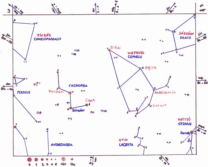 Ezen a lapon megismerhetjük a Cassiopeia (Cas) és a Kefeusz, latin nevén Cepheus (Cep) csillagképeket. Egész évben láthatóak az égen, mert közeliek a sarkcsillaghoz. Jellegzetes csillagképei a Tejútnak. A Cassiopeia W betűjét könnyen meg lehet találni az égen, úgy kb. átelemben a sarkcsillagon át, attól nagyjából egyforma távolságra. A kis körös jelekből látható az is, hogy két csillaga erőteljesen pislákol, vagyis változó csillag. A Kassziopeia csillagkép ősi magyar neve KORCSMA. Cepheus mithológiai alak is, Aethiopia királya, Cassiope férje, Andromeda atyja, akit végül a csillagok közé tettek. De még az sem lehetetlen, hogy valóban onnan származott, és egyszerűen hazament oda. A csillagkép magyar neve Részögembör. |
