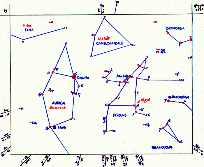 Óramutató irányban haladva a Sarkcsillag körül Találhatjuk a Camelopardalis (Cam) vagyis magyarul a Zsiráf csillagképet, amely a városból nemigen látható, és ugyanígy van ez a Lynx (Lyn), vagyis a Hiúz csillagképpel is, amelynek csak a fényesebbik csillaga, az alfája látszik, az is csak fényszegényebb helyekről. A sarkcsillagtól kissé távolabb, félig-meddig a Cassiopeia alatt látható a Perezeuusz, latinul Perseus (Per) csillagkép, amely lényegében a Tejúton fekszik csak a bal lába lelóg arról. Pont ez a bal lába érdekes nekünk, és be is jelöltem azt az ominózus csillagot egy kis nyíllal, amely fontos lesz az emberiség történetében. Az Algol az a csillag. 98 fényévre van tőlünk. Ide fogják evakuálni az emberiség lelkeit a végítélet során. Ez és a Mirfok a csillagkép legfényesebbje városból is látszik. A balra lévő Auriga (Aur), magyarul Szekeres csillagkép alfája (a Capella, Erichthonius) városból is látható. Alatta majd a Bika csillagkép lesz, de az Auriga szintén a Tejút csillagai között fellehető csillagkép. |