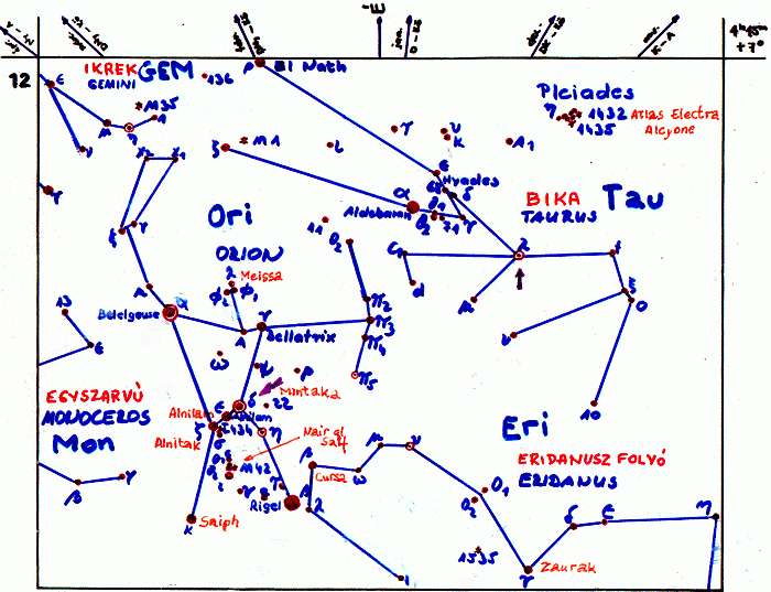 A Tékép közepén dominánsan nyomul a Bika, Taurus (Tau), amelynek legfényesebb csillaga az Aldebaran. Egy hozzánk viszonylag közeli csillag. Az Orionnak (Ori) együtt valódi téli csillagképek. Nem önálló csillagkép, hanem a Bika része a Pleiadok, vagyis magyarul a Fiastyúk. Nagymamám sokszor megkereste nekem az égen. A Bika feje is önálló néven is szerepel, ez pedig a Hiades, vagy a Hiádok. A Bika szarvai között van az M1 galaxis. Az Orion városból is látható az égen (főképpen télen) Nagyon jellegzetes és könnyen felismerhető csillagkép, minden csillaga látszik. Alfája a Betelgause, mellette a Bellatrix. Az öv csillagai balról jobbra Alnitak, Alnilom, Mintaka. A Mintaka külön is izgalmas, mert ott van a négydimenziós kijárat. Ez persze minket nemigen érint, mert még a harmadik dimenziót is tévesen képzeljük el. Az Orion két lába a Saiph és a nagyon fényes Rigel. |