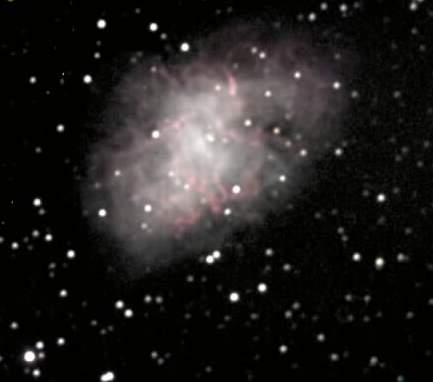 Az M1 szép, de nem galaxis. Lényegében egy szupernova maradvány. Egy csillag felrobbanása nyomán keletkezett. Tágulásának mértéke 1600 km/s , tőlünk való távolsága kb. 6000 fényév. Ez a híres Rák-köd. Ugyanitt van egy rádió és Röntgen pulzár is, ami nagyon szaporán, 0,033 másodpercenként adja impulzusait. Ez az NP 0532 jelet viseli. |
