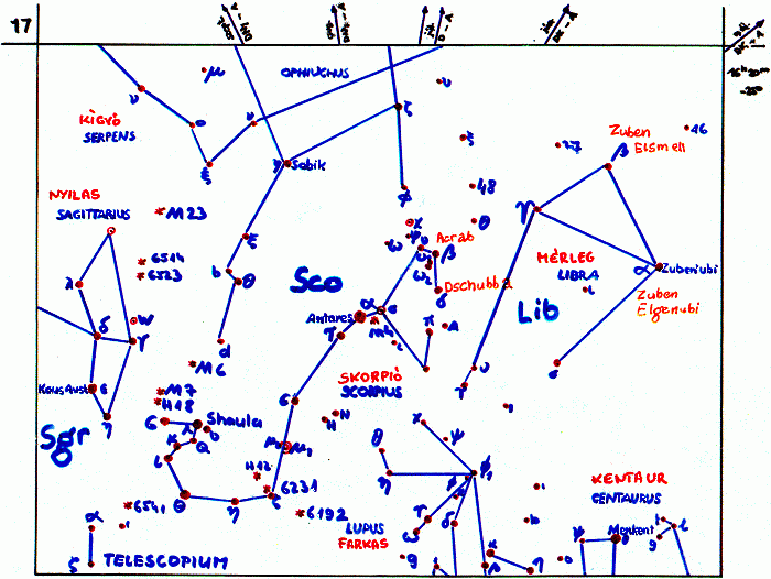 Az ezen a térképen található Messier számozású objektumok közül itt az M 7 -es nyílthalmazt mutatjuk meg, amelynek tagjait akár meg is lehet számolni, bár ha szép az idő, vagy jobb a távcső, akkor egy csillagoktól alaposan behintett területén fekszik az égnek. Úgy kb. nyolcvan csillagból áll. Igen fényes halmaz. Már színházi látcsővel is gyönyörűen látszik. Az M 23 egy még több csillagból álló, de távolabbi nyílthalmaz. Az M 14 egy gömbhalmaz. |