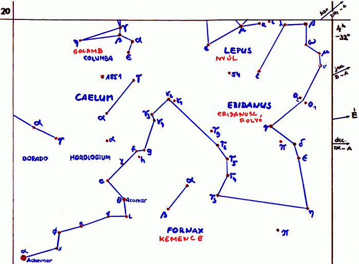 Ezen a lapon teljes egészében látható ez a kiterjedt csillagkép, az Eridanusz folyó, az Eridanus (Eri). A Bika alatt látható a látóhatár mentén. Kiterjedt csillagkép, de mégsem versenyezhet a Hydra (Vizikígyó) csillagképpel, ami a negyed égboltot keresztezi az Oroszlántól a Mérlegig. A Véső, a Caelum (Cae) halvány csillagokból álló csillagkép, amely tőlünk sohasem látható, mert a látóhatárunk alá esik. A Kemence, a Fornax (For) lényegében az Eridanusz folytatása. A kemence tüze, a csillagkép alfája. |