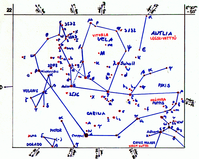 Talán ezt a csillagképet mondhatjuk a déli égbolt leglátványosabb csillagképének. Gerince a Hajó, a Carina és ennek egy mellékcsillagképe a Hajófara, a Puppis, és a Vitorla, a Vela , a Légszivattyú, az Antlia, és a Volans madara is. A Hajó orra az ég déli pólusa felé irányul. Ez pontosan a Déli-Sark felett van. Mindig. Láthatjuk még a Festő, a Pictor és az Arany, a Dorado csillagképek is. Tőlünk ezek a csillagképek sem látszanak. Ezeket csak a déli féltekén élő néptestvéreink láthatták. |