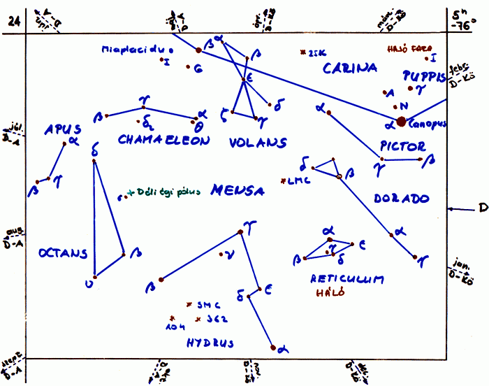 Elérkeztünk a Nadírra, az égbolt legalsó pontjára. Már csak két kicsike csillagkép számít itt újdonságnak. A Kaméleon, a Chamaeleon és a Hydrus. No, és ahogy mondtam, a déli póluson nincsen jelentékeny csillag. Ezen az égtájon nem tolakszanak a galaxisok az égen. Természetesen itt sem láthatók csillagövi jegyek. |