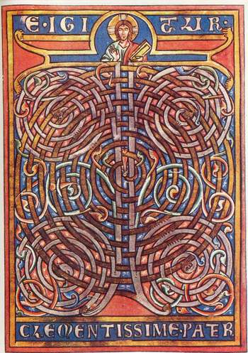 A stílus és a hasonló ábrák nem is olyan ritkák. Eszerint van a kegyelmes atya. Egy központi spirálra átfonódva négy nagy, szintén jobbos spirál tekeredik. Ennek nagyon komoly köze van a Szent koronánk négy ágához, amelyek szintén az atyából indulnak ki, ezek a négy égtáj szimbólumában is megmaradtak, amelyet a királyunk koronázása során kardsuhintásokkal a négy szél irányába vágással szokott megvalósítani. Ez az Univerzum négy szele, és ugyanennek jele a képen Jézus glóriáján a négyágú fény. Mert hiszen mindez a rejtett fény fizikájához tartozó. Isten fény. Nem látható, hanem rejtett fény. Ennek tudása megvan a népművészetünkben is, de ugyanúgy megvan minden ősi tudást őrizgető kultúránál. Eurázsiában mindenhol jellemző, és teljesen független a vallásoktól, mert mindegyik vallás templomaiban megtalálhatjuk. Ezt a képet egészen más időben ábrázolták, és titkos ábra. Ma már a beavatottak sem értik, ezért előkerül, mint érdekes Biblia illusztráció. Itt is az makrokozmosz lényege került ábrázolásra, a téridő (a Mindenható) első elágazásainak tudása, amely köré azután a további rendszerek felépülnek. |