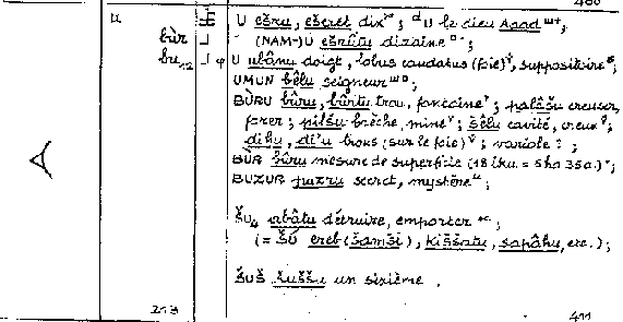 Ennek a jelnek is megvan a maga "evolúciós fejlődése". Itt második lényeges elem jelenik meg a teremtésből. Ameddig az előző jel karcsú és elnyúló ékjel, addig ez vagy tompább nagy közel derékszögű nyíl alakját formázza. A felső "evolúciós" képen egy tele és egy üres kör, és három körív is megjelenik, ami minden bizonnyal a kiáradó forrás képe. Erre enged következtetni az alábbi megfejtés is. Alapértelme: az egyik magánhangzónk, az U. Ad-Ad istennek is fordítja Labat. A kettőzés öreget, idősebbet, régit jelent. Az ad megfelel a magyar ad igének is. Ugyanez nálunk az O értelme is. Ma is használjuk. Az öregapám a TATA. Az AD és a DA ad-vesz értelmű is lesz. A létezésével és a téralap fenntartásával mindent AD ad.