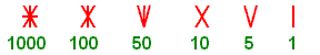 Ebből nekem kutyául hiányzik az ötszázas jel. Ha a tízest középen kettévágjuk, akkor két ötöst kapunk, ha egy százat kettévágunk akkor két ötvenest. Ezért bátorkodom azt gondolni, hogy az ötszázas így nézhetne ki: