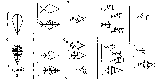 Labat szerint az itt látott ékjelek előtti időben piktogrammokat használtak, és ezek nagyban segítenek a megfejtéshez, bár komoly sejtelmem van arról, hogy ezek nem evolúciós okok miatt szűntek meg, hanem másért. Ez egy másik, párhuzamos írásrendszer volt, mint ahogyan Egyiptomban is három írásformát használtak. De térjünk még egy kicsit vissza a sumer képjelekre!