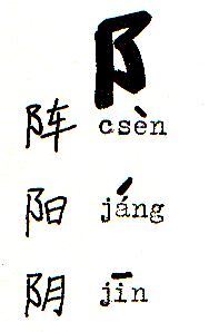 CSÉN; hadrend. JÁNG; a Napjel mellett, itt a pozitív princípium, az aktív, a tűz. A JIN, a Holdjel mellett a negatív a vizes jel. NÁ ugyancsak a Hold jele mellett, de itt jobboldalon. Jelentése AZ!! JÓ egy a forrásjelből kimutató kereszt. Jelentése jobb!! TÓ (TU) jelentése: mindenki. |