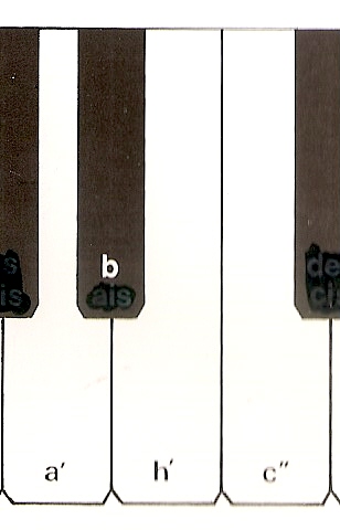 B=bé, A=a, C=cé, H=há. Ezek a hangjegyek nem egymás után, de egymás mellett helyezkednek el. Megmutatom egy zongora billentyűzet ábráján.
