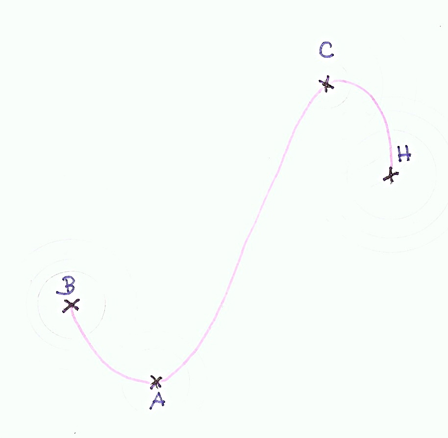 Ugye milyen érdekes ábra jött ki? A térben látók már látják a megoldásomat. Mielőtt eljutunk a megfejtéshez, még valamit hozzá kell tenni. Látók beszámolói szerint a tachion mozgása a következő: oldalt ugrik, átlót ugrik, oldalt ugrik, átlót ugrik... és így tovább. Igen, Bach nevének a betűi is pontosan így viselkednek. Nézzük meg az ábrán.