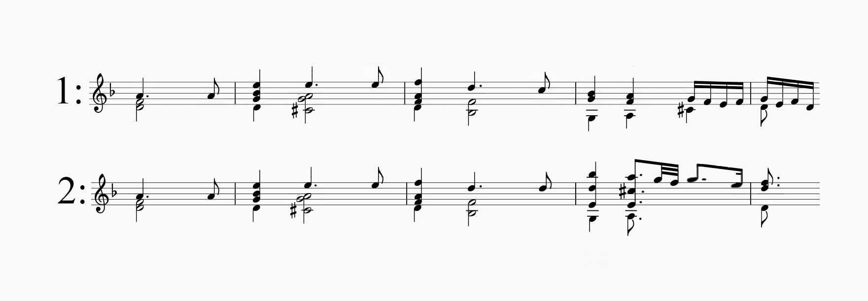 ami az egyik megfelelő feltétele a Teremtésnek. Időfizikailag: A Káoszban való találkozásuk pillanatában mindketten, az Atyának és az Anyának is RV=4,16-al (gyorsabb állapot) kell haladnia, mivel utána a már megérintett múlttereik kölcsönösen 1RV-vel lassítják egymást, így jön létre a teremtéshez szükséges RV=3,16 (lassúbb állapot). A zenei kottában ez a következőképpen nyilvánul meg : a második tritónusz egy kétnegyed értékű hang, az első pedig egy egynegyed értékű hang. Tehát, az első tritónusz pontosan egy értékkel kevesebb, mint a második tritónusz. Joggal kérdezhetitek, hol van az atyai és az anyai Forrás? Ha jól megnézzük a kottát, a második variációban, pontosan ugyanazon a helyen, mint az elsőben, a harmadik és negyedik dallamlépésre jelenik meg a két tritónusz. Sőt, ugyanaz az akkord és a ritmus sem változik. Hasonlítsuk össze az első és a második variáció hangjait: az első hét dallamlépés mindenféle szempontból azonos, azaz megegyezik egymással és csak az utána lévő hangok térnek el egymástól. |