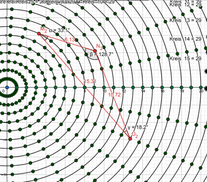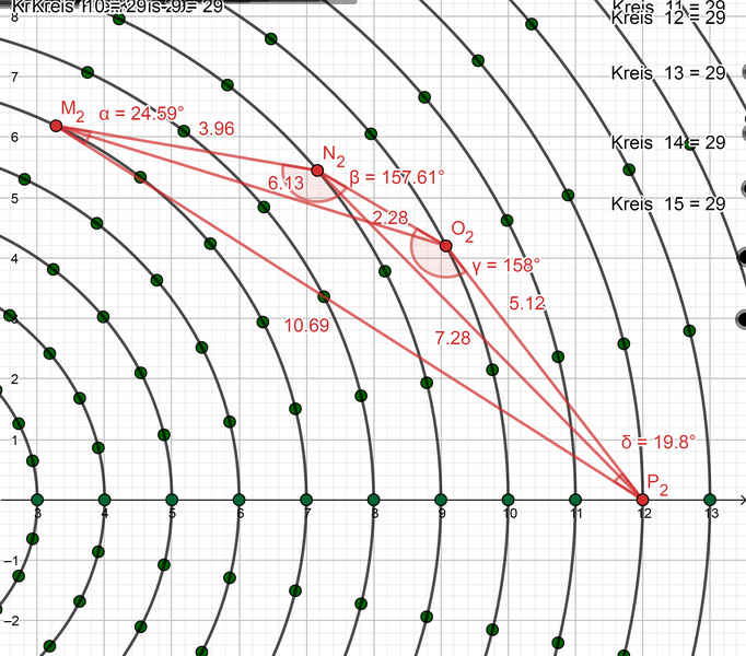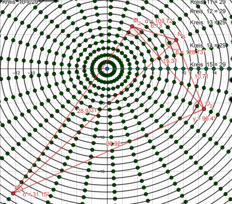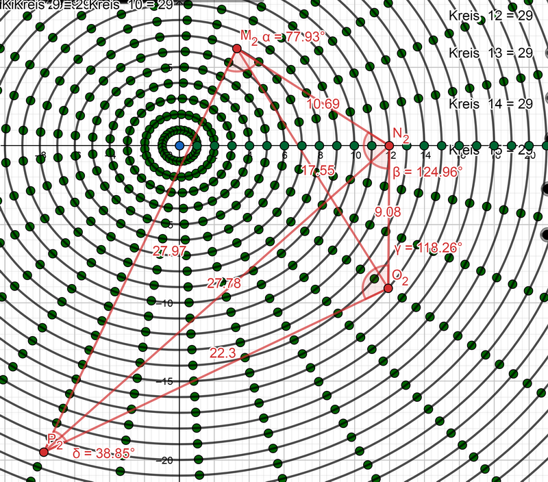 Egyetlen egy hang, a mű alaphangja a „D”. Egy darab ¾ értékű hang. Itt is megtaláljuk a Pí kezdőszámait. Ennek a hangnak felfelé is és lefelé is van egy kottaszár húzva. A hegedűn ezt a hangot két különböző húron kell megszólaltatni egyszerre. Mindkét húron ugyanaz a „D” hang szólal meg, csak másképpen. Egy hangot hallasz, de ha jobban kinyitod a füledet, meghallod, hogy ez igazából kettő hang. Ő az Atya és az Anya, amikor már (újra) Egyek: egymásban teremtettek saját Univerzumokat, melyek tükörképileg ellentétes forgásúak, keletkezésűek voltak, de saját identitással és most Egyénileg dolgozzák fel a teremtésük tanulságait a teremtési Korszak végén, amely egy Új Teremtési Korszak Nyitánya . . . Az első 9 akkord területének kódolása, a Teremtés feltételei Már régóta keresem a megoldást, hogyan tudnám a kottaképet térben ábrázolni. Még nem sikerült, de lassan el fogok jutni a megoldáshoz. A mostani ábrázolások még síkbeliek, de ez feltárt egy újabb roppant érdekes teremtési kódot, ami közelebbre visz bennünket az igaz valóság megismeréséhez. Elkészítettem a Chaconne első 10 variációjának a hangkészletét. Jelentése: hány darab, illetve milyen hangok szerepelnek a variációkban. Összesen 29 fajta hangot különböztetünk meg. Ebből kettő hang egyik variációban sem szerepel, de ez nem jelenti azt, hogy ők nem léteznek, hanem csak nem nyilvánulnak meg, ezért a helyüket meg kell hagyni. Szerkesztettünk 29 kört egy közös pont köré egyenlő távolságban úgy, hogy minden körön egyenlő távolságban 29 pontot helyeztünk el. 3 ábra Minden pontsor végére beírtam a hangok nevét. A legmélyebb hanggal kezdjük, majd utána sorban következnek a hangok a külső kör mentén haladva körbe, amíg nem érünk vissza az eredeti ponthoz. A legmélyebb hang mellé érkezik a legmagasabb hang. A másik szabály: a legbelső pont a legmélyebb hang, a legnagyobb átmérőjű kör pedig a legmagasabb hangnak felel meg. Innentől kezdve csak meg kell keresni a hangok helyét és egy másfajta ábrázolási módszer tárul elénk. Ezután szerkesztettük meg az első variáció 9 akkordját úgy, hogy a hangok bejelölése után összekötöttük a pontokat vonalakkal, így különböző mértani síkidomokat kaptunk. Kiszámoltam a mértani alakzatok területét. A kerületeit azért nem számoltam ki, mert a jövőben ezek az ábrák térbeliek lesznek, így a mostani eredmények félrevezetnének bennünket. A területek aránya egymáshoz képest viszont nem fog változni, így ezeket tudjuk használni. Mutatom az akkordokat, hozzá a mértani síkidomokat a méreteikkel. Minden akkord violinkulcsban van egy bé előjegyzéssel. Első akkord: