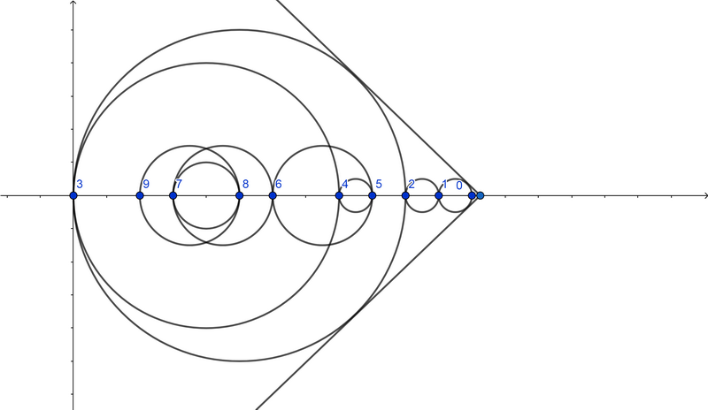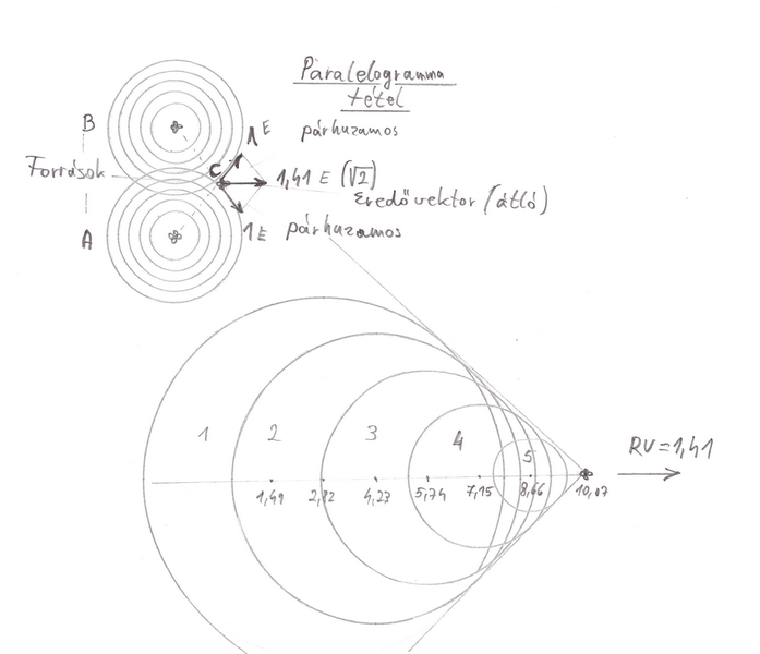 Sokáig tanulmányoztam az ábrámat, és lassan kitisztultak a kódok. Ez az ábra a Teremtés feltételeit hordozza magában. A zene haladási iránya a „0” pontnál van. Ezt a pontot egy olyan szögben szerkesztettem meg, amiben benne van az összes többi kör, tehát a kettes és hármas pontot átölelő legnagyobb kör a szög horizontja. Logikusan a „0” pont elé fog esni a szög csúcsa. Ez a szög kb. 87 fokos. Pontosan akkora, mint az első Tűz palástjának (a körökhöz húzott érintő) szöge sík ábrán megszerkesztve. RV=1,41