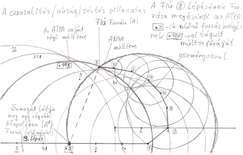 Teremtő Fiú azonos az Atyával, ezért az Atya látja meg saját magát maga előtt menni. Ez az okság sértés az Univerzum létalapja. Vessük össze a két ábrát! A 15. ábrán négyzettel bekeretezett 3-as szám az Első Atya Forrásának az a helye, ahol abban a pillanatban meglátja, megérinti a Fiú 8. lépésének Forrása. Ebben a pillanatban az Atya 10 E-vel táguló múltszféráját érinti a Fiú Forrása. A 13. ábrán az első pont, a hármas szám az Atya 3. (bekeretezett) előző Forráshelye. E Forráshely nélkül nem lenne teremtés. Ez a Forráshely az első fontos Hely a Teremtésben. A Chacconne ezzel az akkorddal indul. A 13. ábrán a kettes pont a Fiú 8. lépésének a Forrásával egyezik meg. A kottában egyébként ő a nyolcadik akkord. A két pontot összekötő kör szintén 10 E, mint az Atya (bekeretezett) 10 E-vel táguló múltszférája. Számoljuk össze a kottában és a 15. ábrán hány lépés távolságra van az Atya és a Fiú Forrása egymástól az okság sértés pillanatában! Pontosan 10 lépésre mindkét ábrán. Ez a pont az Első Atya megjelenése. A Teremtés egyik legfontosabb feltétele a Atyai és az Anyai Forrás felhasadása, „kettéhasadása”.