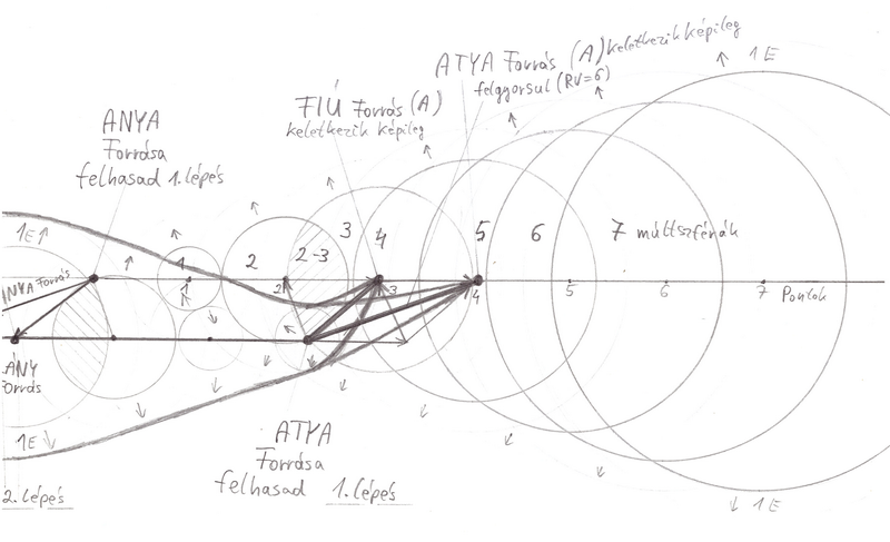 17 ábra Ebben a lépésben találkozik az Atya a saját felhasadás pillanatának információját hordozó múltszférájával, ami által képileg az Első Atyából keletkezik a második Teremtő Atya. Az én ábrámon ezt a 3-4-es kör írja le. A három az Atyai Forrás, ahol az okság pillanatában (nálam a 2-3-as kör, a kettes a Fiú) keletkezik az Első Atya, a második Teremtő Atya keletkezésénél pedig a felhasadás pillanatának a 8 E-vel haladó múltszféráját érik el. Nálam az ábrán a 3-4-es múltszféra pontosan 8 E. Folytatás jön. |