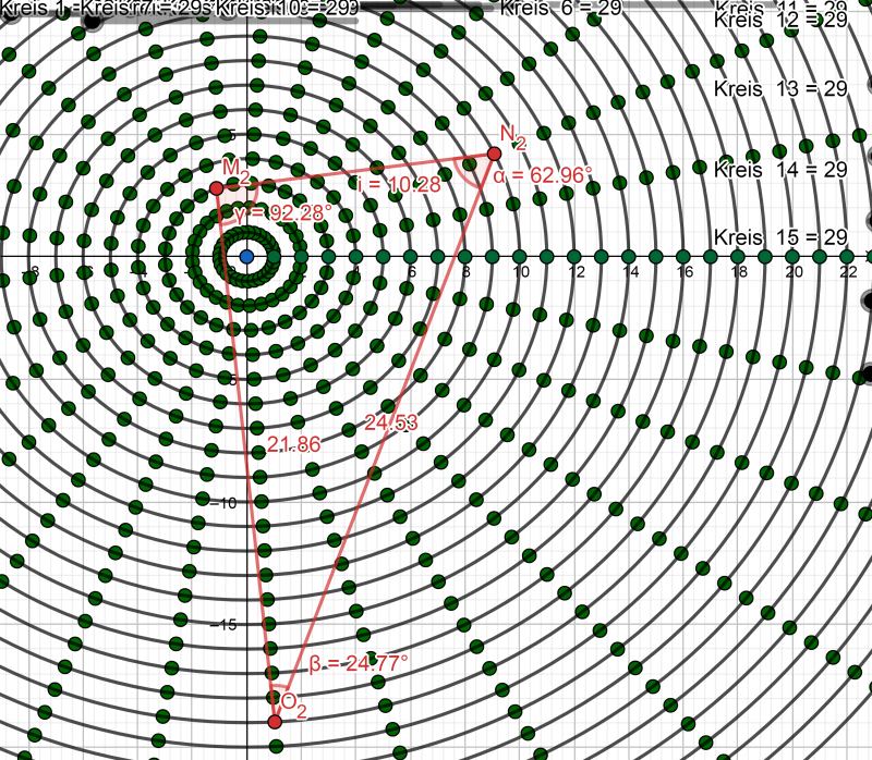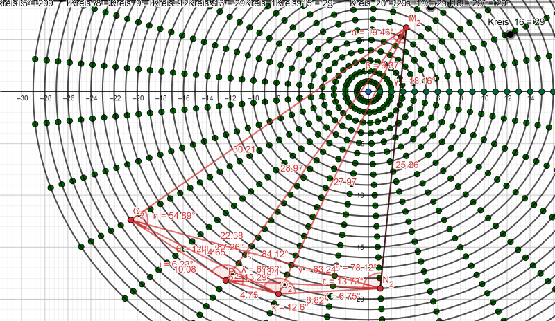 8. Ábra T=309,450….. Elkészítettem a területek táblázatát. Az első sorban az akkordok száma, a második sorban a hozzátartozó területek összege, a harmadik sorban pedig a területek alapján létrejött nagyságrend van. A legkisebb terület a legalacsonyabb számot kapja, a legnagyobb terület pedig a legnagyobbat.