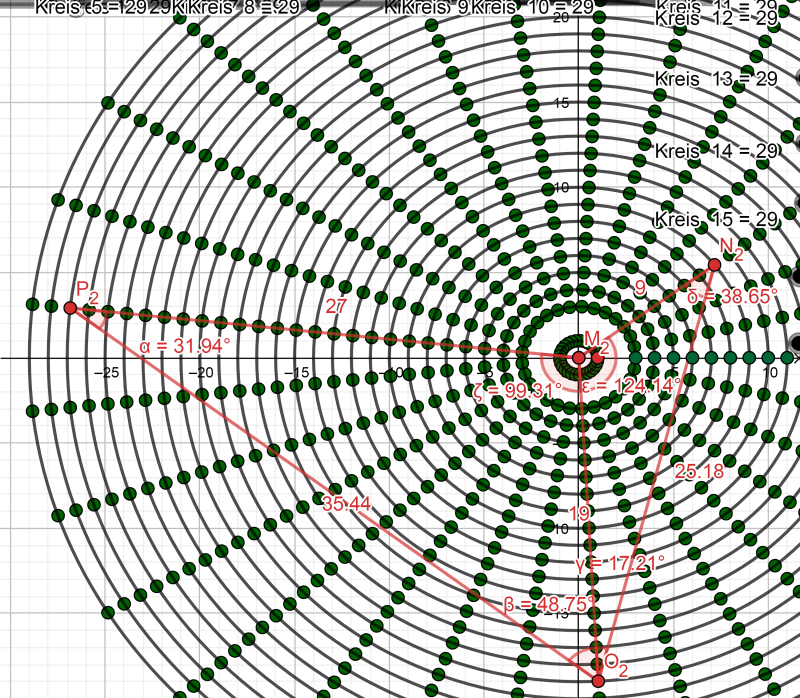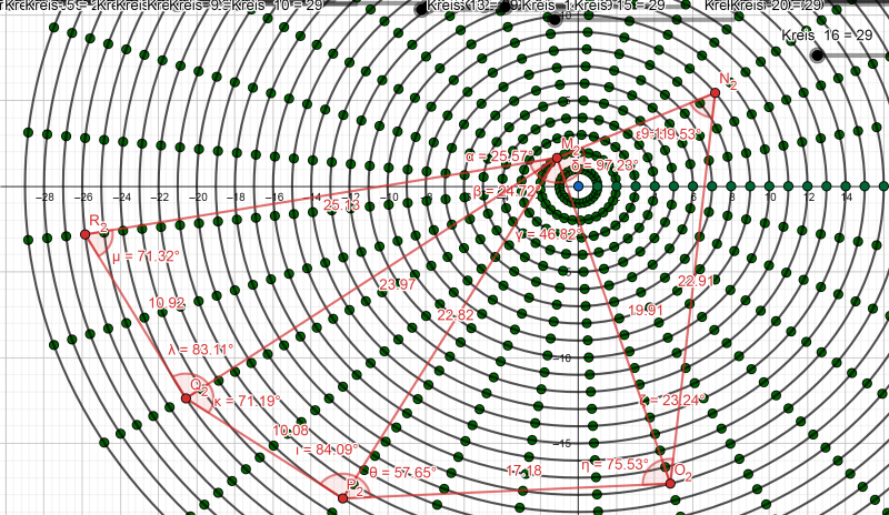 10. Ábra Mint a 12. fejezetben kört szerkesztettem az egyes és kettes pont között, úgy hogy a kör átlója az egyes és kettes pont közötti távolság, tehát a kör érinti az egyes és kettes pontot. Majd a kettőt a hárommal és így tovább. Ezután összekötöttem a külső köröket érintőkkel, úgy hogy az érintők metsszék egymást, így egy érdekes alakzatot kaptam. Ránéztem az ábrámra és egy szó jutott az eszembe: űrhajó. A mai napig él bennem ez a gondolat, azt szokták mondani, az első pillanat megérzése az igaz gondolat. Természetesen megmértem a szögeket. A felső és alsó szögek: 120,66°-osak. A baloldalra eső kúpszög: 38,95°-os. A jobboldalon levő kúpszög pedig 79,74°-os. A következő megoldásokra jutottam. Az itt látott ábra egy kétdimenziós, síkbeli alkotás. Hány darab háromszögből tevődik össze a Téridő Gyémántja? Pontosan nyolc darab egyenlő oldalú háromszögből, 4 felül, 4 alul, mindegyik oldalukkal egymást érintve és minden háromszög szögei 60°-osak. Az én síkbeli ábrámon felül és alul is 120,66°-os szöget találunk. Osszuk el ezt a számot kettővel. 120,66: 2=60,33 Tehát az ábránkat felül is és alul is kettő plusz kettő darab 60 fokos szögekbe záródó háromszögekre oszthatjuk fel, amikből 4-et láthatunk, ha berajzolnánk az ábránkba (síkban egymás mellett helyezkedik el a két háromszög). A kétdimenziós ábrázolásnak van egy hátoldala is, ahol ugyanez a 4 darab háromszög van. Így található meg a Téridő Gyémántja az ábrámon. A szépség kedvéért megkaptuk Jézus számát is, a 33-as számot, illetve Jézus titkos számát a 66-ot. A 33 nyolcszor szerepel, a 66 négyszer. 33x8=264 az Atyai és Anyai univerzumban 2x64 dimenzió létezik. A baloldali kúpszög 38,95°-os. Mivel az egész szerkezet (a zene) állandó mozgásban van, forgásban van, mint az Univerzum, mint minden a Teremtésben, ez a kúpszög megfelel az RV=3,16-os sebességnek. Nézzük meg az aranymetszés helyét, pontját. 38,95x0,618=24,0711 Mi a 24? Az első Teremtmények, a 24 Vén. Vagyis ennek a kúpszögnek az aranymetszésében születnek, születtek meg a Vének Tanácsa. A jobboldali kúpszög 79,74°-os. Önmagában nem árul el sok mindent ez a szám, vagy még nem ismerjük értékeit. Elosztottam kettővel. 79,74: 2=38,67 Újra és újra feltűnik az RV=3,16 Ráadásul itt kétszeresen. Ugye ez nem véletlen? Nézzük meg ennek a számnak is az aranymetszés eredményét (a kisebbik értékét)! 79,74x0,382=30,46068 Igen, ő az RV=4,16 Tehát ez a szám magában rejti kétszeresen az RV=3,16-ot, talán ők az Anyai és Atyai Teremtő kúpszögek, illetve az RV=4,16-ot, a Teremtés előtti sebességet is. Akkor most vizsgáljuk meg az ábrám belsejét.