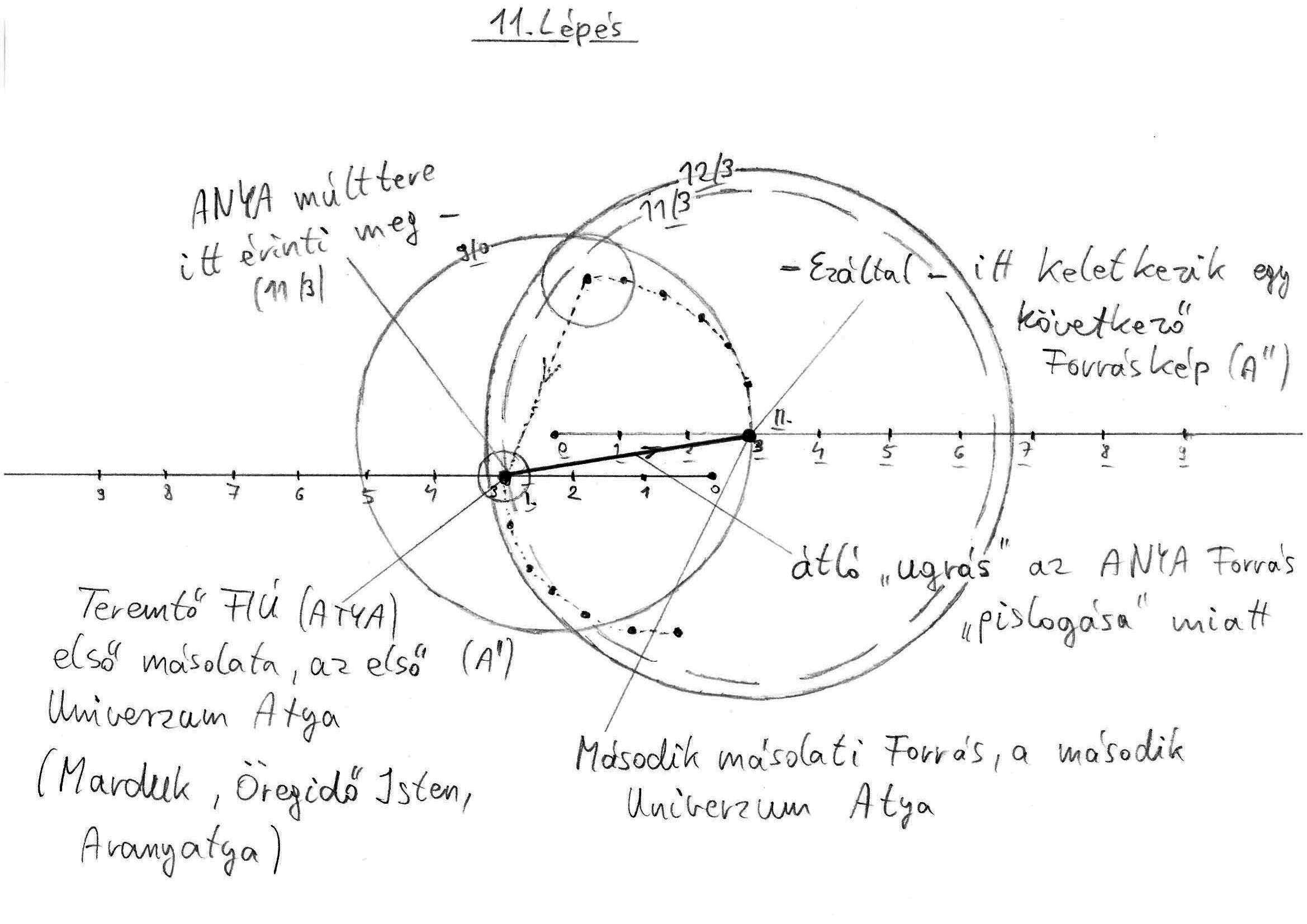 12. Ábra (forrás: Takács Zoltán: Zorausz könyve) Az én ábrámon az Atya és az Anya Eseményvonala egyben van. A 11-es ábrán az egyes pont az Események eleje, ez a pont a 12-es ábrán az Atya Eseményvonalán az ötös pontnak felel meg. Mi történik itt? Az első Felhasadáskor létrejött gömbhullám 9E-vel tágult Atyai múlttere itt érinti meg az Ő korábbi múltját. A második érintési pont, itt a második Atya, ami az Anya Eseményvonalán a 3-as aláhúzott ponton van. Az én ábrámon ez a kettes számmal jelölt hely. A 9E-vel tágult múltszféra pedig pontosan megfelel az én ábrámon az 1-es és 2-es pont köré rajzolt körnek. A 12-es ábrán az Atyák születéséről van szó, az én ábrámon, mivel a két Eseményvonal egybe esik, nincs meghatározva, hogy ez az Atyai, mert ugyanúgy lehet Atyai, mint Anyai, hiszen mindkét oldalon ugyanaz történik, csak a forgások ellentétesek egymással és váltakozva keletkeznek, mivel egymást léteztetik. A 12. ábrán a Marduk, az Öregidő Isten az Atya Eseményvonalán a 3. Hely. Az én ábrámon az 5-ös ponttal jelölt hely, ami az én Eseményvonalamon a második helyen van. A 12. ábrán pontosan itt érinti meg az Aranyatyát az Anya 11E-vel táguló múltszférája. Ez a múltszféra nálam az 5-ös és 6-os pontokat átívelő kör. A 12-es ábrán kiemelt két múltszféra (Atyai 9/3 és Anyai 11/3) mindenféle szempontból megfelel az én általam szerkesztett két körnek, az 1-2-es, illetve az 5-6-os pontokat átívelő köröknek. A két kör ugyanolyan arányban íveli egymást mindkét ábrán, az idősebb Atya (Anya) forráshelye és az utána létrejövő Atya (Anya) forráshelye ugyanolyan arányban helyezkedik el egymástól mindkét ábrán. Elvégeztem egy pár számítást. Az én ábrámon a két nagy kör eseményvonala 20 egység. Megnéztem az aranymetszés pontját. 20x0.618=12,36 Ez a pont a 2-es pontnak felel meg, az új Atyai Univerzum, az új Anyai Univerzum forráshelye. Az én ábrámon az 1-2-es pontot