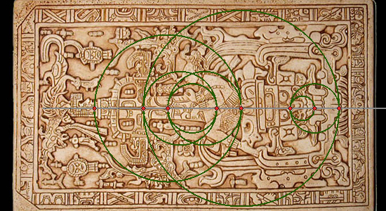 16 egység, sugara 8 egység. Nézzük meg az aranymetszésüket! Vagyis a két kör, múltszféra aranymetszési aránya a két kör sugara, ráadásul még fordított arányban van egymással, hiszen az egyiknél az aranymetszés nagyobbik aránya, a másiknál pedig a kisebbik aránya egyezik meg. Jobbos? Balos? Az én ábrámon az 5-3-4-2-es pontok közötti rész a Felhasadás ábrázolása. A 12. fejezetben az első variáció kódolt ábráján ugyanezt az állapotot találjuk meg (ott a 9-7-8-6-os pontok közötti rész). Minden új Atyai és minden új Anyai Univerzum létrejötténél lenni kell egy új és újabb felhasadásnak, ahol a Források egy kettős idősűrűségű zónába érkeznek, ahol a látott kép(ek) miatt kettéválnak. Az én ábrámon a 3-4-es kör a kettős idősűrűségű zóna, az 5-4-es és a 3-2-es pedig a hármas idősűrűségű zóna. Természetesen itt is megtalálható a jobbos (2-3-4) és balos (5-4-3) Felhasadás. Még hiányzik az én ábrámon a 6-7-es és a 7-8-as körök titkainak feltárása. A 7-8-as egy 1E-vel táguló múltszféra, a 6-7-es kör pedig egy 2E-vel táguló múltszféra. Az új Univerzumok létrejöttekor az Atya (Anya) 1E-vel tágul, az előző, idősebb Atya (Anya) ebben a pillanatban pedig 2E-vel tágul. Az itt leírt szabályokkal, törvényekkel jönnek létre az Atya és az Anya párhuzamos Univerzumai és azok fraktális rendszerei. Még most is hihetetlen, milyen csodálatos módon rejtette el Johann Sebastian Bach Chaconne-ja Teremtő Istenünk Titkait. Ennek a fejezetnek a végére tartogatok még egy kis csemegét. Ráillesztettem az én ábrámat Pacal király szarkofág fedőlapjára anélkül, hogy bármilyen aránybeli változtatást csináltam volna bármelyik ábrán. Lássuk.