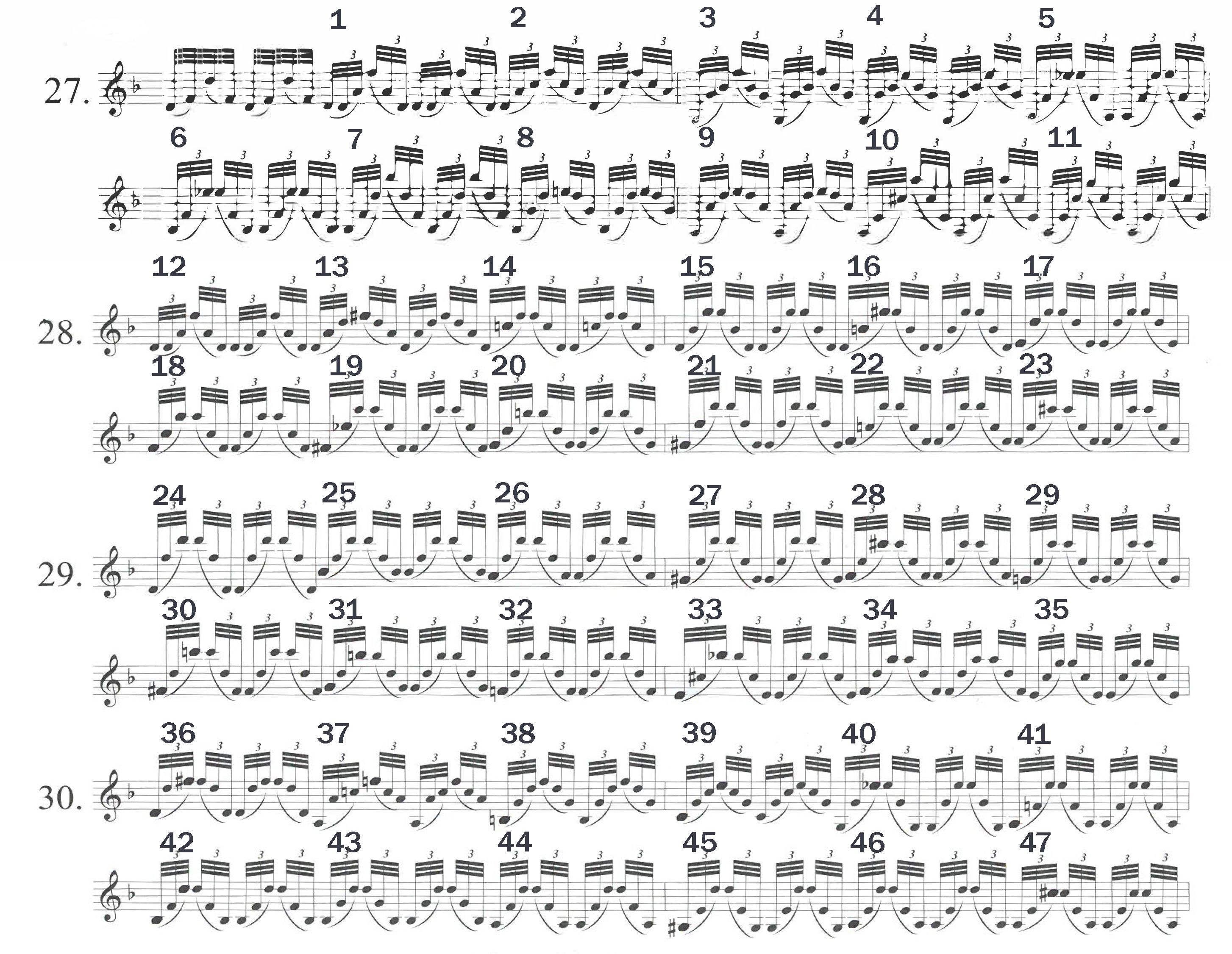 Ez a Chaconne 27., 28., 29. és 30. variációja. Az előző fejezetet a 27. variáció első negyedéig elemeztük, ez volt az utolsó Egység (az itteni első 8 Hang). Jól látható a különbség, a második negyed ütéstől egy másfajta lüktetés, ritmus észlelhető és ez a fajta ritmusképlet, mozgásképlet jellemzi az egész mostani részt. Ezt a részt szintén fel lehetett osztani Egységekre, ezeket a számokat láthatjátok a kottakép fölött elhelyezve. 47 Egység van, egy Egységen belül 6 darab Hang szerepel és mivel továbbra is megmaradt a két pólus létezése, tehát minden Egység egyszer ismétli önmagát, ezért egy Egységhez kétszer hat Hang tartozik. Kezdjük a ritmus megfejtésével. Megmarad a 32.-ed értékű lüktetés, mint a korábbi 4-es alakzatokban, csak a négy Hang kétszer három Hangra cserélődik. Minden hármas hangcsoport össze van kötve és mindegyik fölé van írva egy kis 3-as szám. Mit jelent ez?