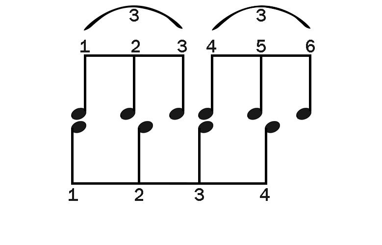 A következő ábrán bemutatom, hogyan kell lejátszani ezt a hat hangot, illetve hogyan viszonyul egymáshoz a 4-es és a 6-os ritmusalakzat.