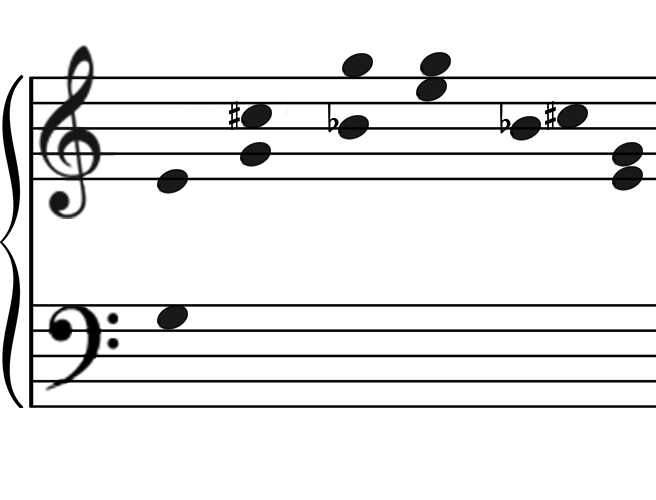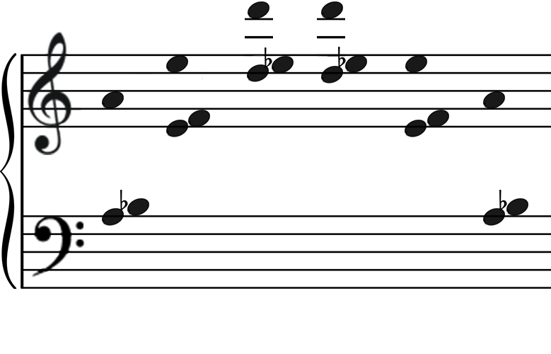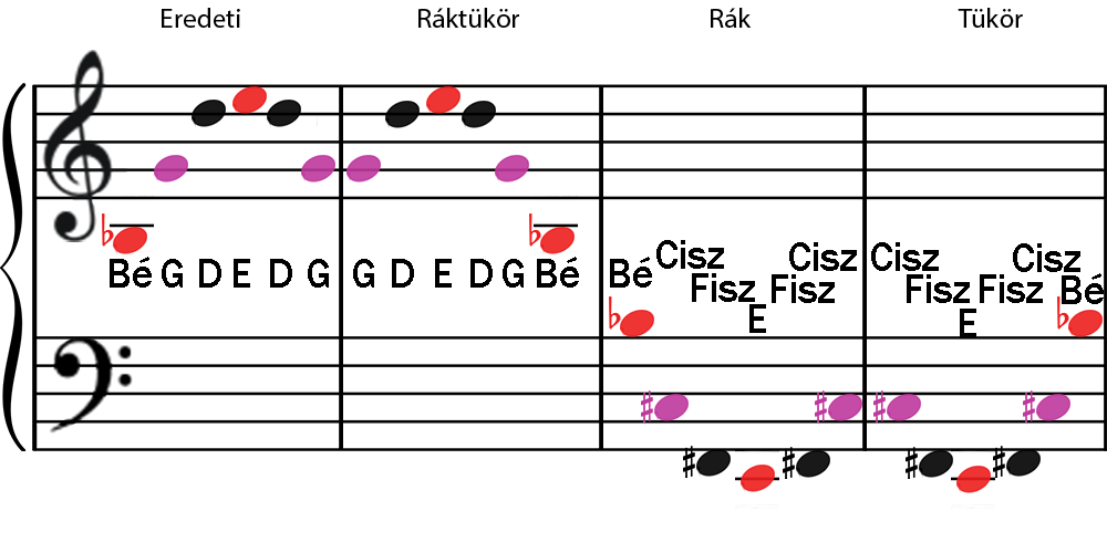 Hangtávolságok: 0 és 12, a második Hangoknál: 12, 5 és 7, a harmadiknál: 0 és 12, a negyediknél: 12, 10 és 2, az ötödiknél: 12, 10 és 2, végül a hatodik: 0 és 12.