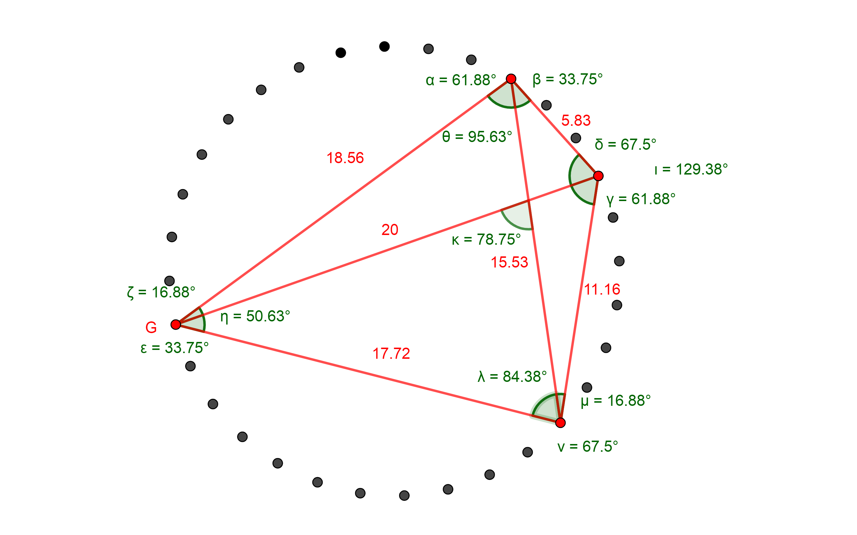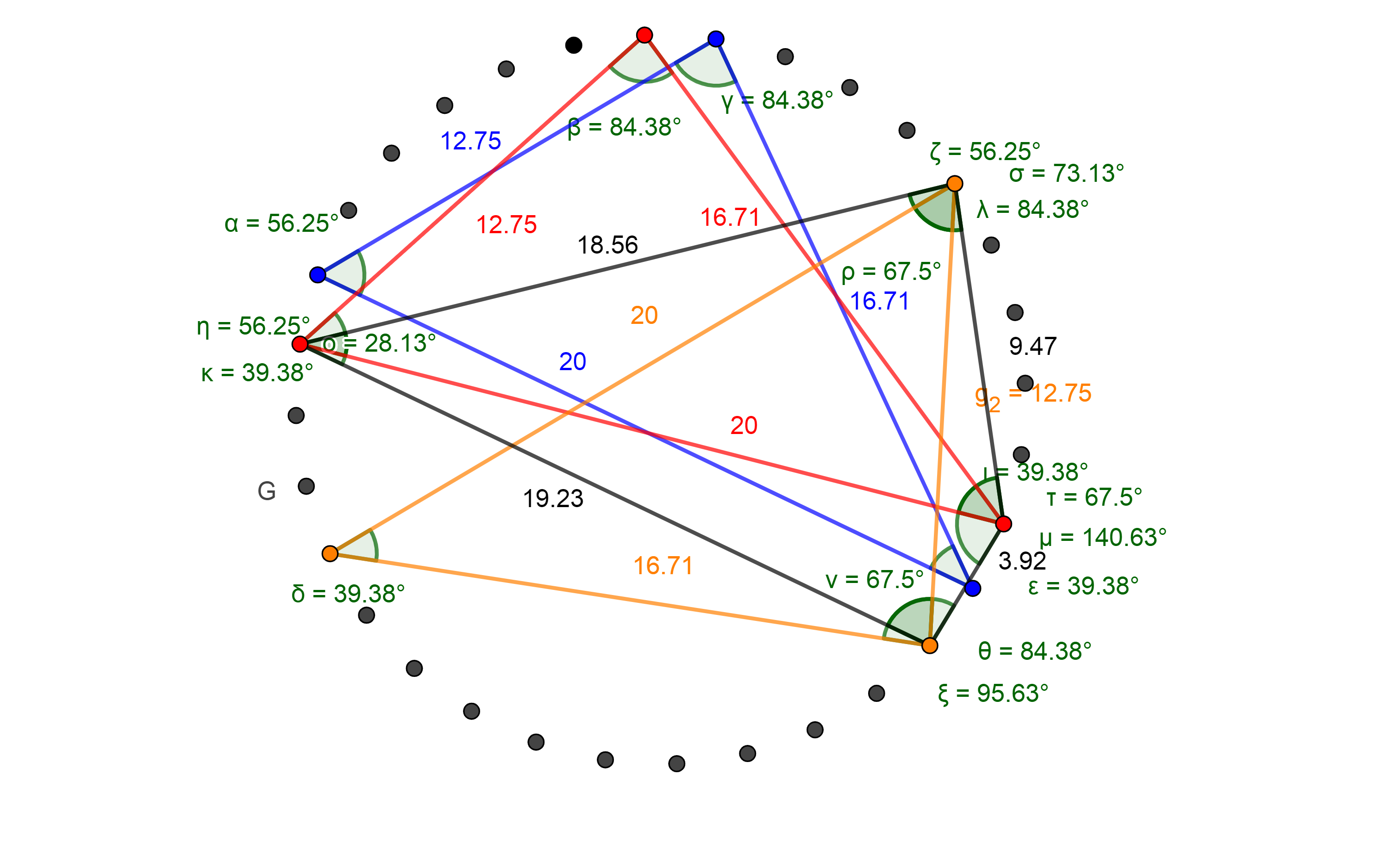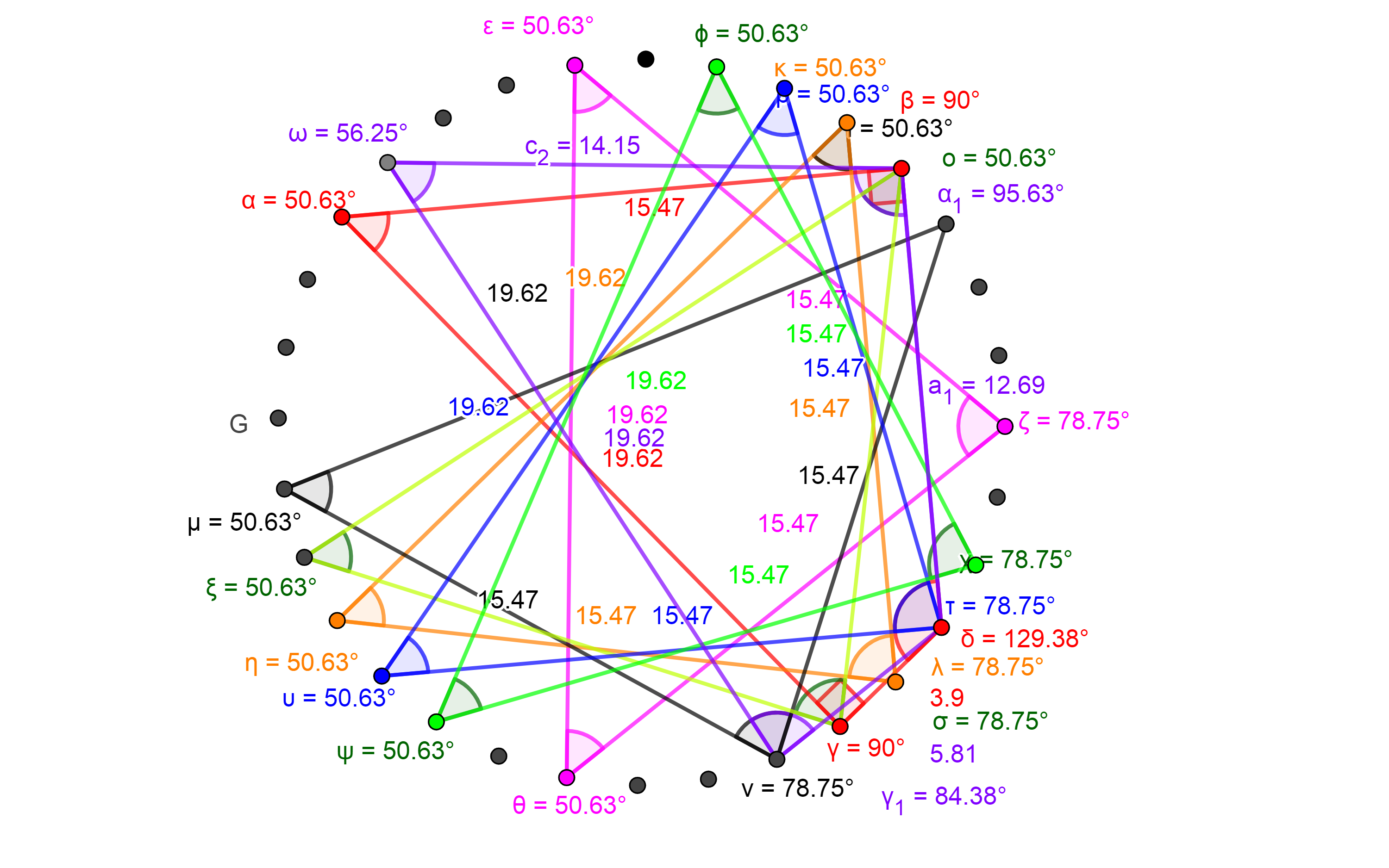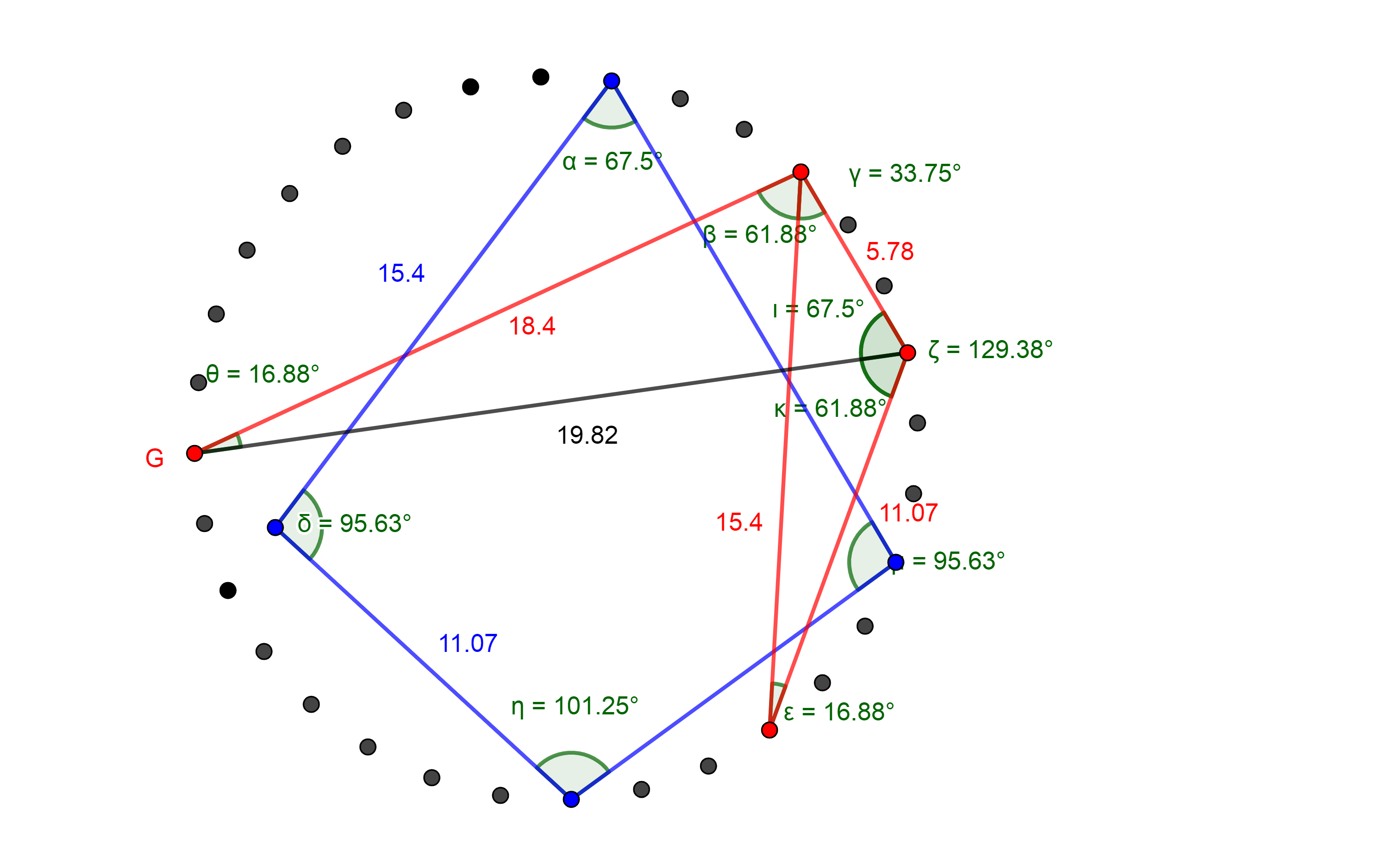 Az 59. ábrán fekete színnel jelölt átló, ami az egyik 67,5° oldala, aranymetszésben metszi a kék színű négyszögnek azt az oldalát, amelyik szintén a 67,5° egyik oldala.