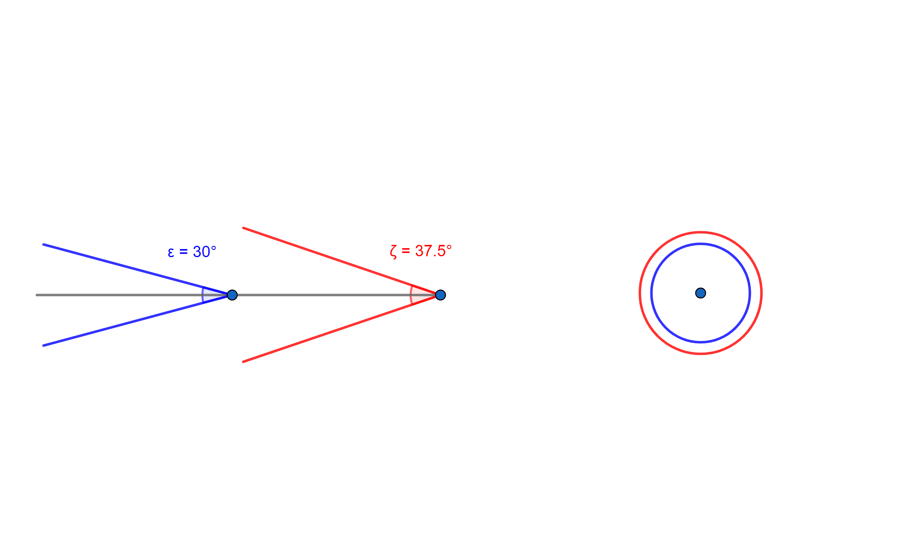 Amikor a két kúpot oldalról nézzük, akkor külön látjuk őket, ellenben 90°-os fordulat után szemlélve egyben látjuk (két körnek) őket, amit viszont síkbeli kiterítésnél egymás mellett (30+37,5) értelmezhető. Így magában foglalja a találkozási (RV=4,16) és a találkozás utáni sebességet (RV=3,16).