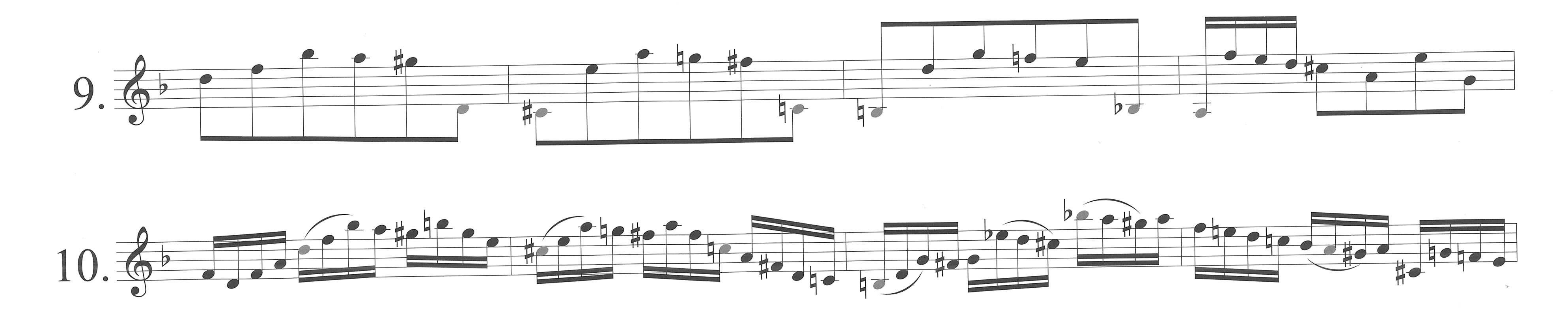 A 9. és a 10. variáció 26 Hangtávolságot, és 27 Hangot tartalmaz. Ebből a 27 Hangból kettő Hely üresen marad, egy Esz és egy H Hang Helye, tehát 25 Hangról beszélhetünk. A két üres Hely között 7 betöltött Hanghely van, az alsó üres Hely alatt 6 betöltött, a felső üres hely fölött pedig 12 betöltött Hanghelyet számolhatunk össze. Ha egy körbe rendezzük a Hangkészlet Hanghelyeit, akkor 18 Hang követi egymást, majd egy üres, aztán 7 Hang, majd megint egy üres Hely zárja a kört. Összesen 74+1= 75 Hangot számolhatunk össze a két variációban.
