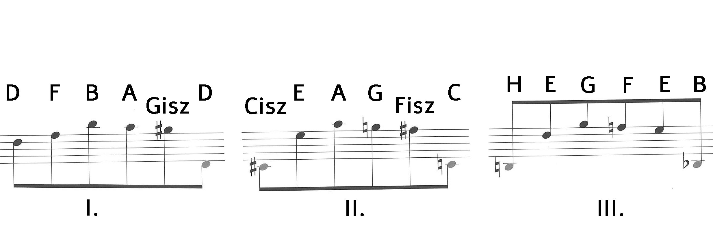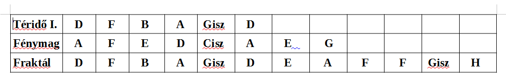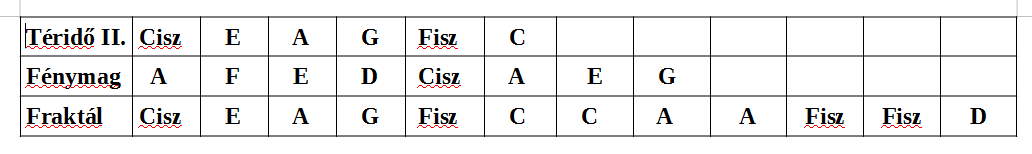 Még egyszer felsorolom a három Téridő Hangjait: D, F, B, A, Gisz, D, Cisz, E, A, G, Fisz, C, H, D, G, F, E, és B.