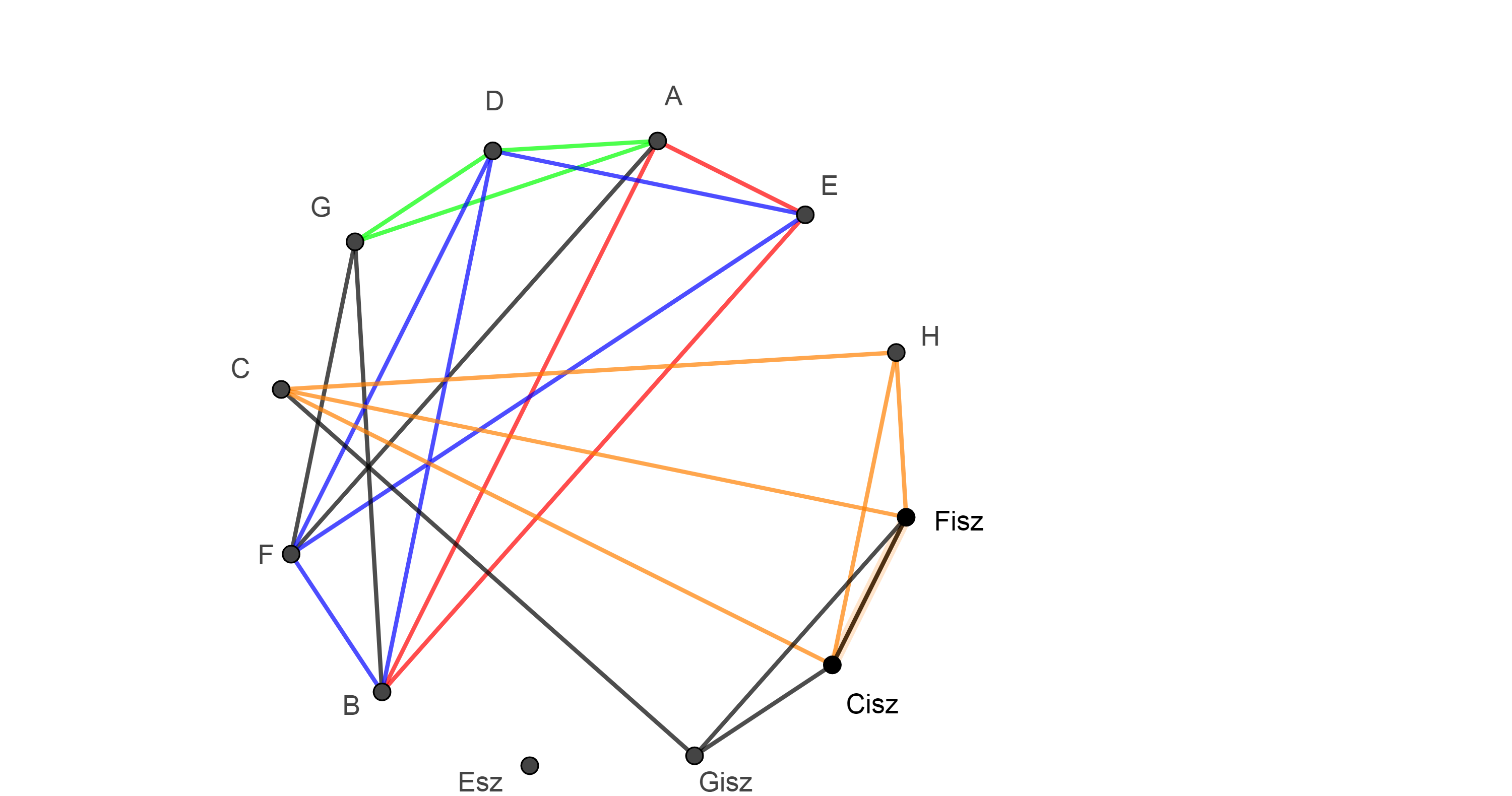 A B, a D, és az F Hangok az első és harmadik Téridőben keletkeznek, a G és az E Világok a második és harmadik Téridőben jönnek létre, az A Hangok pedig az első és második Téridő Világaihoz tartoznak. Ha jobban megvizsgáljuk az összekötéseket, észrevehetjük, hogy különböző tetraéderes csoportot rejt magába az ábránk. Ezért színesek a vonalak, ámbár több közös vonal, átjáró, átjárás létezik, amiket megpróbáltam egy másik színnel jelölni. Lejegyzem az általam elkészített, felfedezett tetraéderes kapcsolatokat.