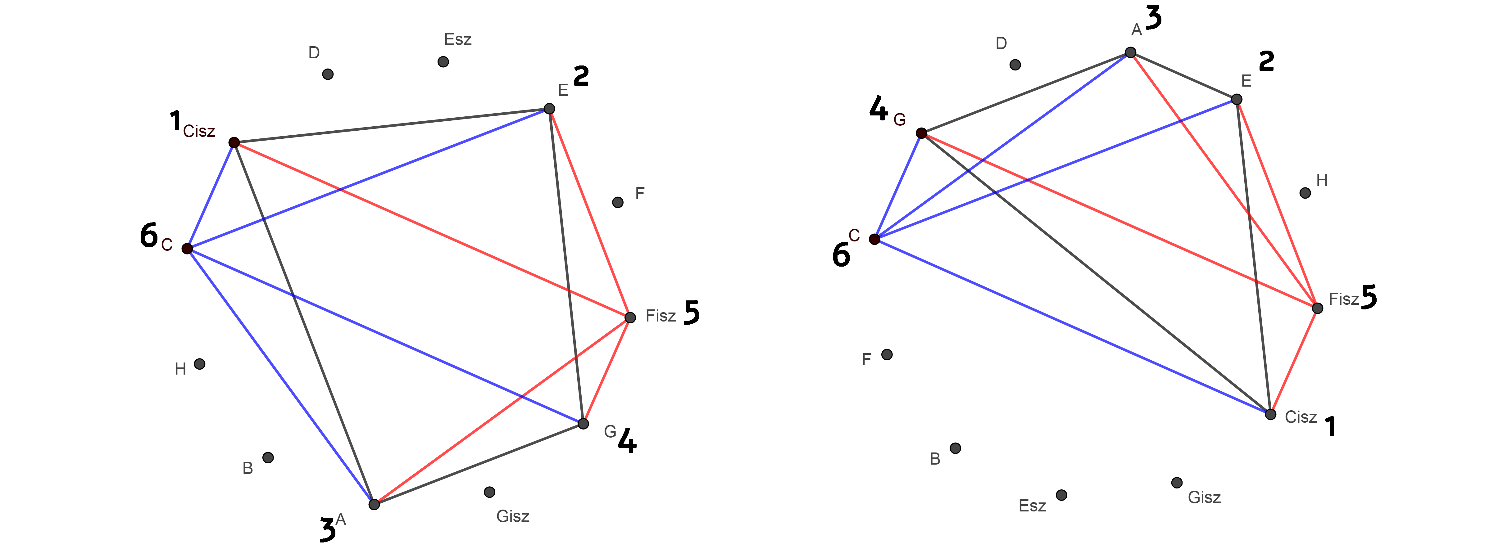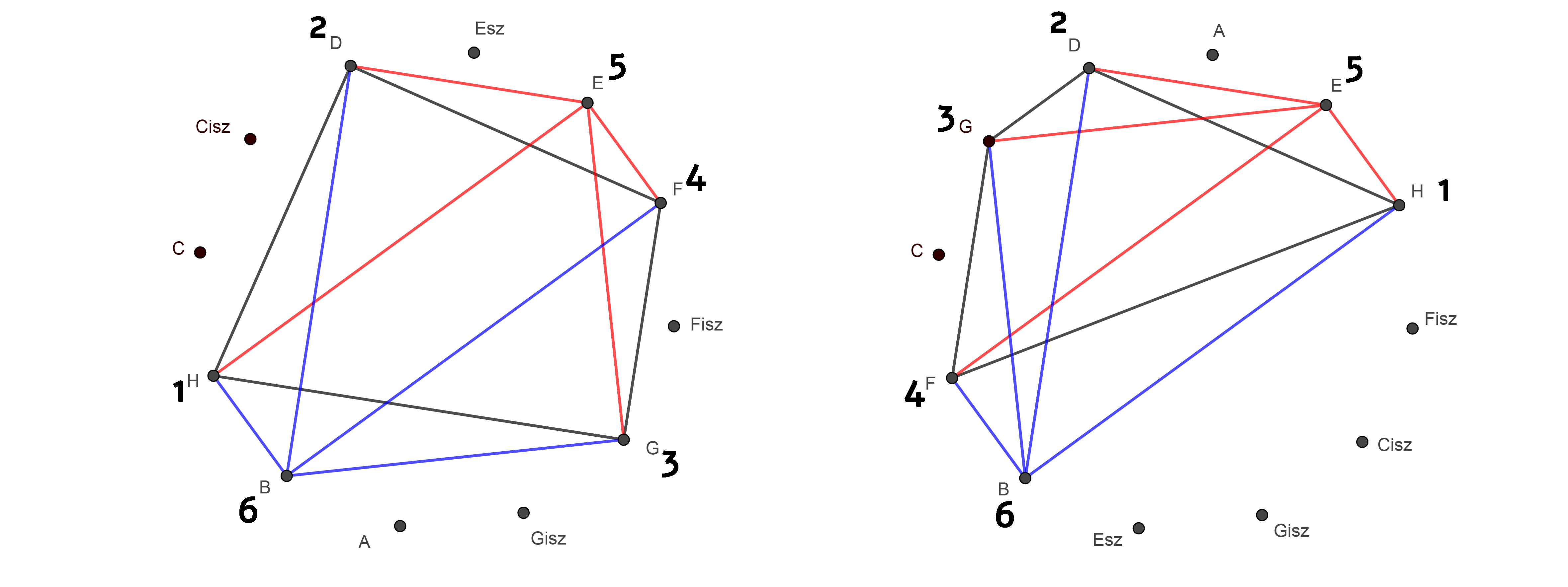 Az első ábrán csodálatosan felismerhető az oktaéder alakja. A Hangok mellett szerepel a lépések száma, pontosan úgy, ahogyan a kottában követik egymást a Hangjegyek. A kékkel és pirossal jelölt vonalak az oktaéder két csúcspontjából kiinduló kapcsolatok a többi Forráshelyhez, a kék, a C Hang a hatodik, a piros, a Fisz Hang pedig az ötödik Forráshely. Ha figyelmesen végigvezetjük a lépéseket, itt is megtalálható az oldallépés, és az átlóugrás. Milyen véletlen.