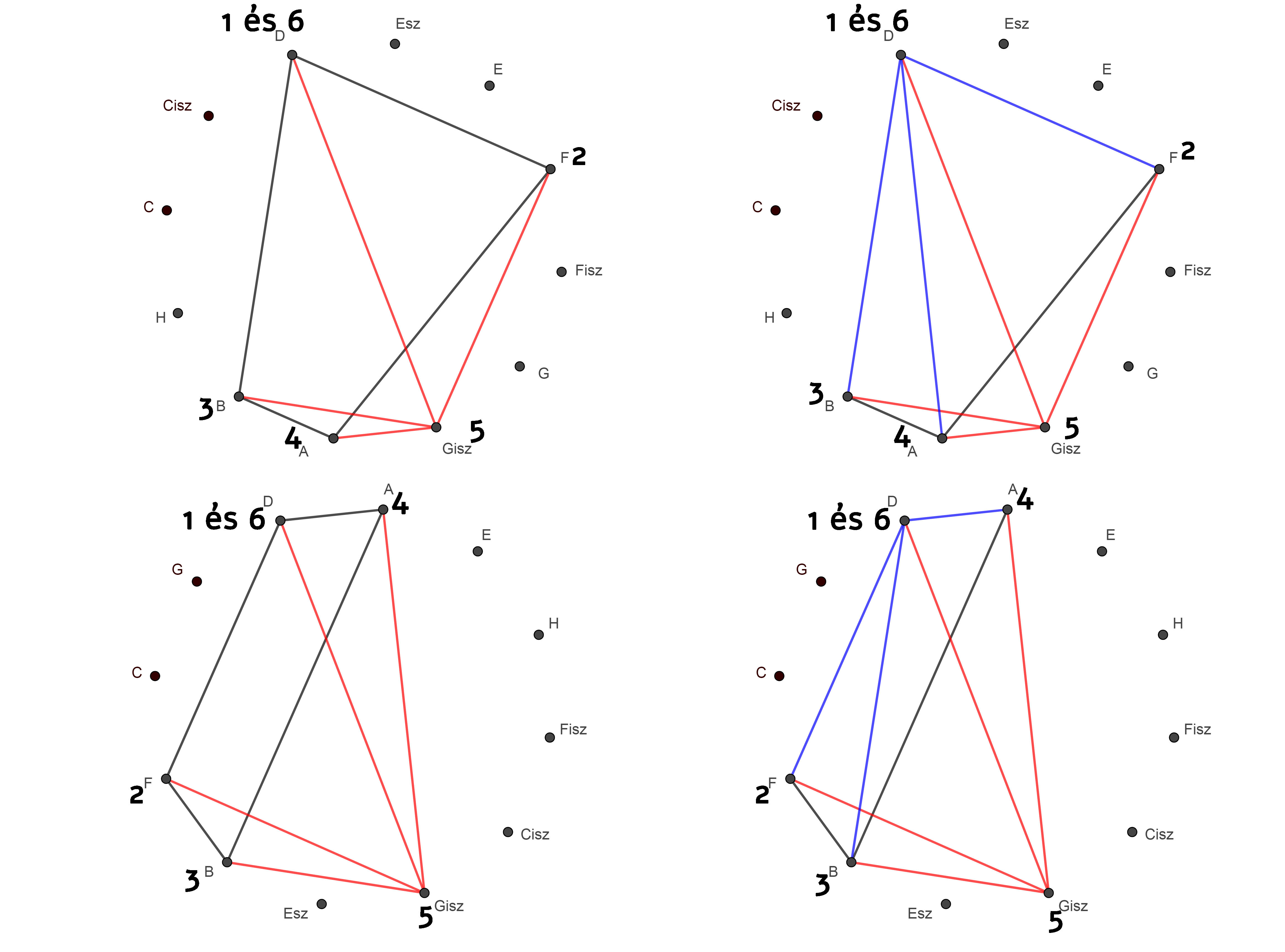 C-Cisz-Fisz-H, C-Gisz-Cisz-Fisz, B-G-A-E, B-F-E-D, B-F-G-A, és F-G-D-A. Mindenképpen érdemes elgondolkozni ezeken az összefüggéseken, várom az ötleteiteket.